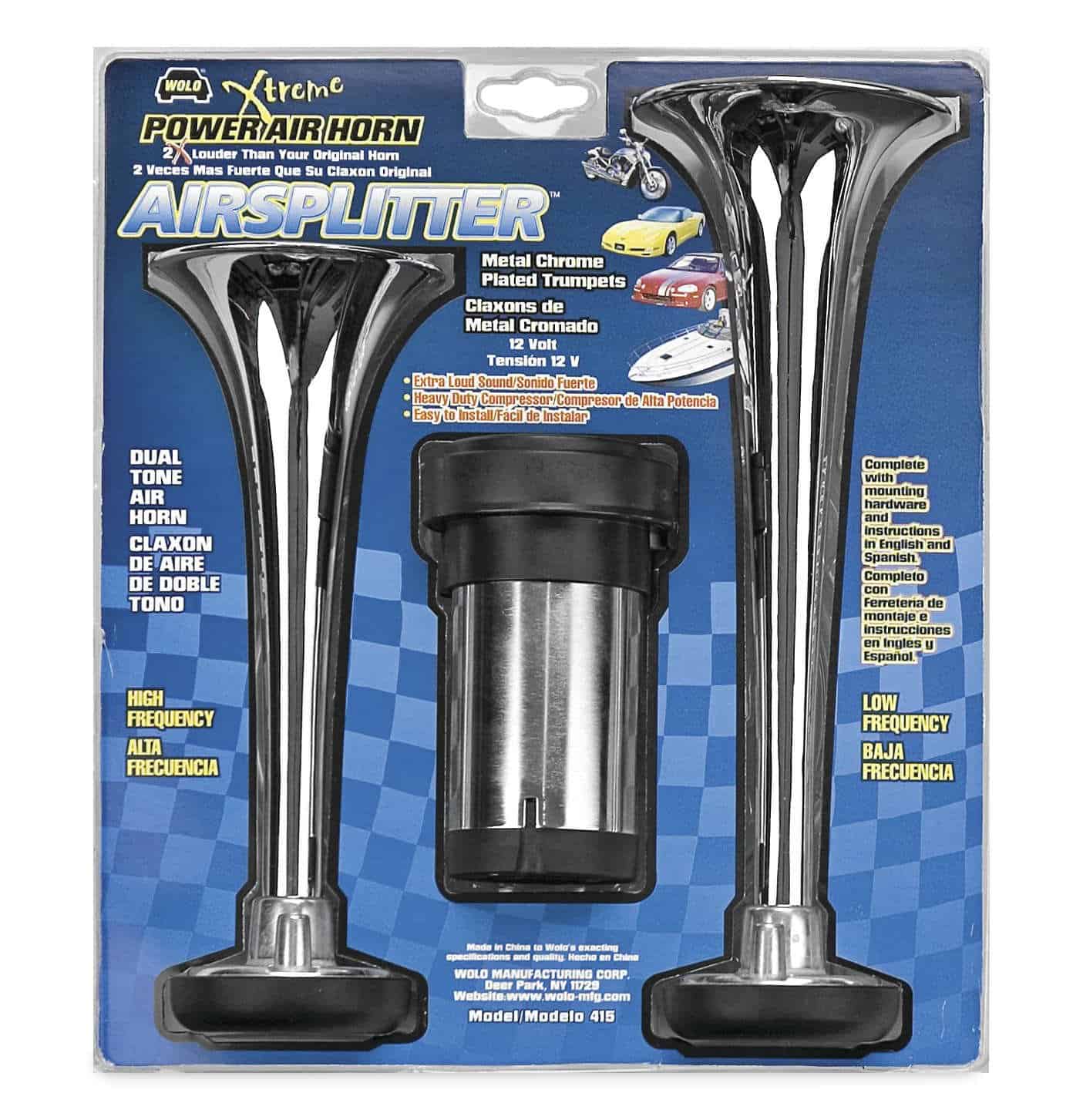 El Wolo 415 cuenta con dos (2) brillantes trompetas de metal cromado que producen un sonido que seguro se escuchará. Ideal para el propietario de vehículo que desea tener bocinas cromadas para lucir debajo del capó. Fácil de instalar en cualquier vehículo de 12 voltios. Airsplitter es también la bocina de elección de los propietarios de motocicletas, será una gran adición a cualquier bicicleta. Así que si quieres un sonido potente, que seguro se escuchará, entonces Airsplitter es la bocina para ti. Viene con un compresor cromado resistente, relé de 30 amperios, manguera y hardware de montaje. Instrucciones en inglés / español.