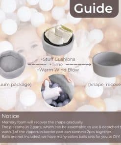 Estas lujosas piscinas de bolas hechas a mano de alta calidad por Wonder Space serán las favoritas en cualquier sala de juegos y son perfectas para niños pequeños y más grandes. Proporciona diversión sin fin a los niños y tiene una influencia positiva en el desarrollo de los niños. Además, es cómoda para tumbarse y jugar con tus hijos. Todas nuestras piscinas de bolas están hechas a mano con materiales respetuosos con el medio ambiente, que son líderes en el mercado en piscinas de bolas modernas de alta calidad. Características: Puede ser llenada con hasta 500 bolas. Fácil de transportar y almacenar. Totalmente hecha de espuma (laterales y fondo) Cubierta desmontable hecha de una tela agradable al tacto (95% algodón, 5% elastano). La cubierta con cremallera se puede quitar fácilmente para lavar a mano o a máquina (lavar a 40 grados). Dimensiones: Diámetro exterior: aprox. 90 cm Diámetro interior: aprox. 78 cm Altura: aprox. 33 cm Grosor de los laterales: aprox. 6 cm Grosor del fondo: aprox. 1 cm NOTA: 1. Las bolas NO están incluidas. 2. Después de recibir tu piscina de bolas, por favor, permite que recupere su forma redonda después de haber sido doblada para el transporte. 3. Hay dos cremalleras en el cuerpo de la piscina, una de ellas se utiliza para conectar la parte inferior de la piscina. 4. Al ser un producto hecho a mano, el tamaño puede variar un poco de las especificaciones, por favor, comprende y acepta esto. 5. El color de la piscina de bolas puede variar un poco respecto a las imágenes debido a la resolución de la pantalla. 6. Puede existir olor cuando recibas la piscina de bolas, te sugerimos ponerla en áreas bien ventiladas durante 3-5 días para desodorizar.