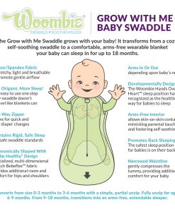 La Woombie Grow With Me es un saco de dormir y manta portátil de 5 etapas que cubre a su bebé en crecimiento de 0-9 meses con una longitud adicional BONUS para alcanzar hasta 18 meses, cubriendo todas las etapas de sueño saludable y exitoso para su bebé! Etapa Uno: Saco de Dormir — (0-3 Meses/5-13 lbs). Para bebés de más de 20 pulgadas de largo. Coloque al bebé dentro del saco de dormir y simplemente cierre la cremallera desde la parte inferior hasta la parte superior. Etapa Dos: Saco de Dormir — (2-4 Meses/12-16 lbs). Para bebés de más de 22 pulgadas de largo. Desabroche el saco de dormir 2/3 camino hasta la esquina inferior opuesta. Se expande 1.25″ y agrega 4″ de longitud. Etapa Tres: Saco de Dormir Expandido — (3-6 Meses/14-19 lbs). Para bebés de más de 24 pulgadas de largo. Desabroche completamente el saco de dormir con los brazos del bebé permaneciendo adentro para el mismo toque reconfortante. El saco de dormir se ensancha más de 3″ en ancho y de 4-8″ en longitud. Etapa Cuatro: Manta Portátil — (6-9 Meses/20-25 lbs). Para bebés de más de 24 pulgadas de largo. Con el saco de dormir completamente desabrochado, abra los broches de brazo en los lados para permitir el sueño «sin brazos», transformando el saco de dormir en una cálida y acogedora manta portátil. BONUS Etapa Cinco: Manta Portátil XL — (9-18 Meses/20-28 lbs). Para bebés de 27-33 pulgadas de largo. La tela en la parte inferior del saco de dormir se alarga para crecer con su bebé!