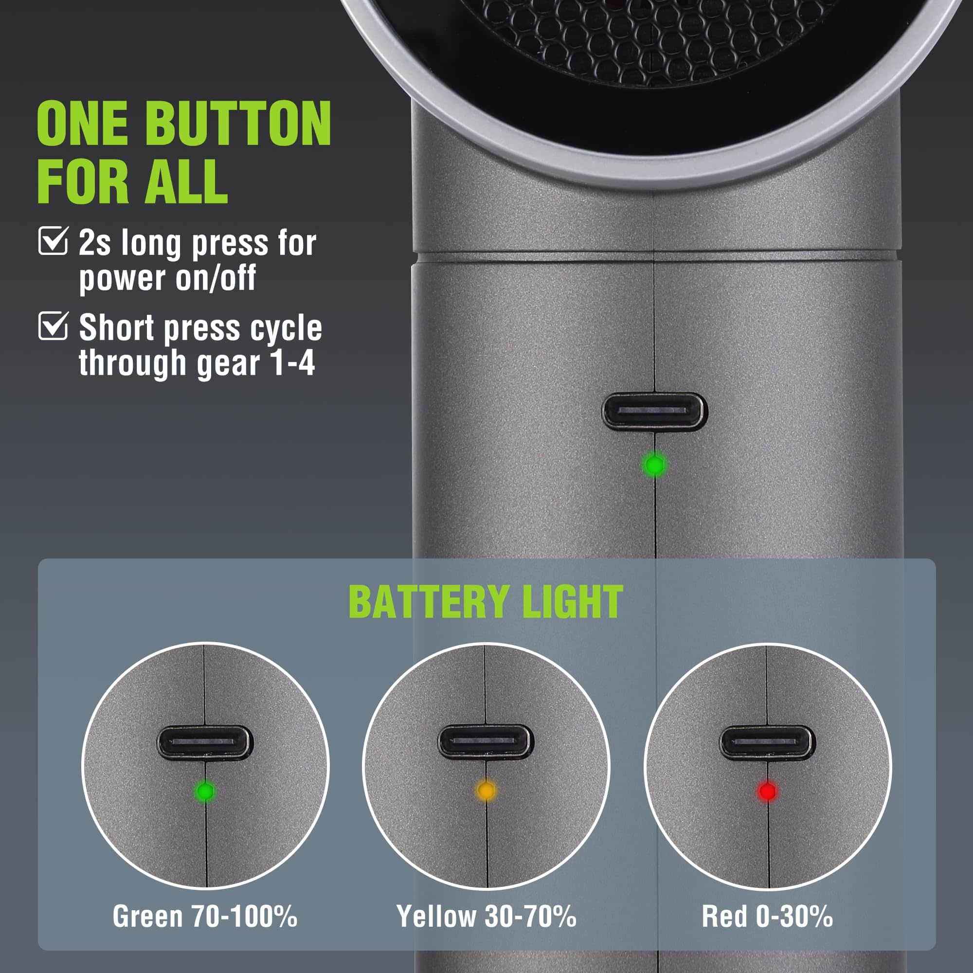 Simplifique su limpieza gracias al control de un botón para ajustar la potencia y la velocidad, no se necesitan configuraciones complicadas. El indicador LED incorporado le mantiene informado sobre la duración de la batería y el modo de velocidad de un vistazo. Con un peso de solo 0.69 lbs, este soplador de aire compacto y ligero es fácil de sujetar, transportar y usar en cualquier lugar, haciendo que la limpieza sea un juego de niños.