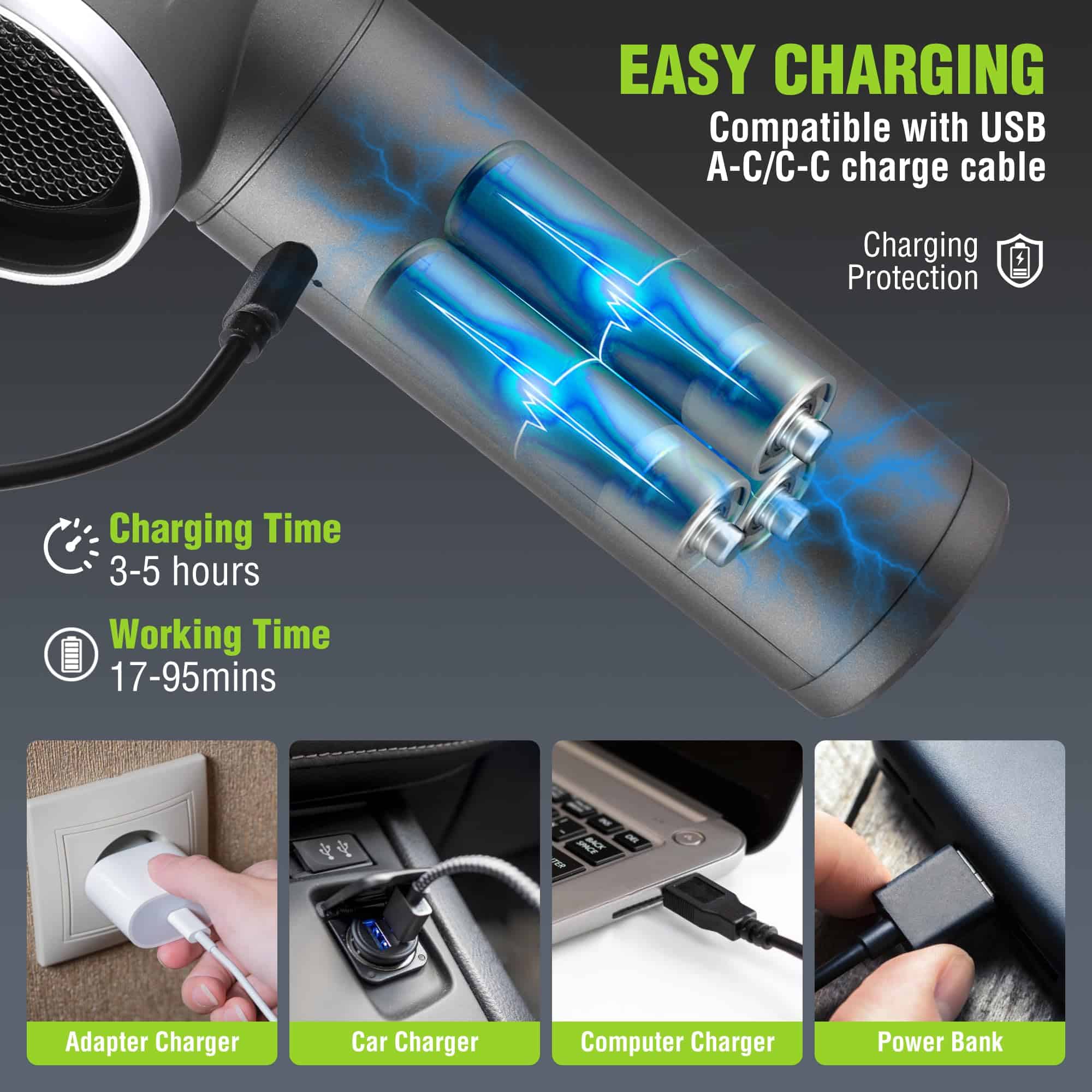 Unido a eliminador de polvo y desechos sin esfuerzo con nuestro soplador de aire eléctrico de alto rendimiento. Con un motor ultrapotente de 120,000 RPM y una velocidad máxima del viento de 50 m/s, ofrece una potencia de limpieza excepcional para electrónica, teclados, interiores de automóviles y más. Con 4 ajustes de velocidad ajustables, puede abordar superficies delicadas o polvo obstinado con precisión y facilidad.