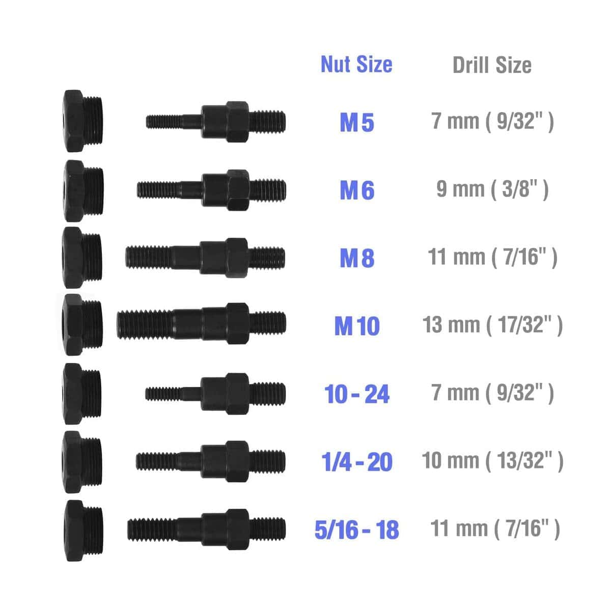 Especificaciones: br 1PC remachador manual: Longitud: 15″ (390mm) Carrera: 7mm br 1PC Llave de función múltiple br 7PCs Mandriles y boquillas roscadas intercambiables: M5, M6, M8, M10, 10-24, 1/4-20, 5/16-18 br Cada 10PCs: Tuercas de remache de acero: M5, M6, M8, M10, 10-24, 1/4-20, 5/16-18 br br br Nota: Esta herramienta está destinada a usarse para instalar tuercas de remache métricas M5, M6, M8, M10, M12 y SAE 10-24, 1/4-20, 5/16-18, 3/8″, 1/2″.