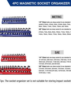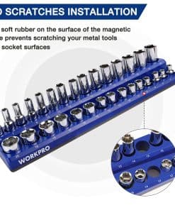 Este juego de organizador de sockets magnéticos de WORKPRO es la solución perfecta para mantener tus sockets organizados y fácilmente accesibles. Con capacidad para almacenar hasta 108 sockets de tamaño métrico y SAE, este set incluye dos organizadores magnéticos métricos azules y dos organizadores magnéticos SAE rojos para unidades de 1/4″ y 3/8″, pero ten en cuenta que los sockets no están incluidos con los organizadores. La base magnética de los organizadores asegura los sockets en su lugar designado, evitando que se caigan incluso si das vuelta la bandeja boca abajo, y también te permite adherir la bandeja a cualquier superficie de acero para mayor comodidad. Además, la superficie de la base magnética es de goma suave, por lo que no tienes que preocuparte por rayar la superficie de tus herramientas y sockets metálicos. Cada bandeja de socket tiene una etiqueta legible, lo que facilita encontrar el socket correcto en lugar de buscarlo en una caja de herramientas desorganizada. Este juego de organizadores de sockets magnéticos es adecuado para almacenar sockets de tamaño estándar y profundo, tanto métricos como SAE, para que puedas colocar tus sockets de manera segura y ordenada. Coloca tus sockets en un cajón montado en el costado de tu caja de herramientas o en cualquier otro lugar conveniente para acceder a ellos en cualquier momento. Por favor, ten en cuenta que este juego de organizadores de sockets magnéticos no es adecuado para almacenar sockets de impacto.