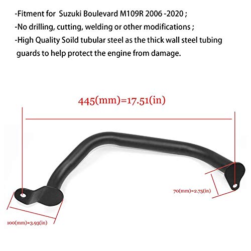 Descripción Material: Acero tubular sólido; Color: Negro; Peso: 4 kg; Diámetro de la barra: 25 mm; Alta calidad y durabilidad; Hardware de montaje incluido; Protección contra caídas a baja velocidad; Compatible con SUZUKI BOULEVARD M109R 2006-2016, Suzuki Boulevard M109R BOSS 2014-2022, Suzuki Boulevard M109RZ Limited 2007-2009, Suzuki Boulevard M109R Limited Edition 2011-2014, Suzuki Boulevard M109R2 2008-2009.