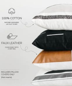 Los cojines decorativos son una forma fácil de acentuar un dormitorio o sala de estar, pero las fundas de cojines de tiro de diseño moderno y trendy pueden resultar costosas. En Woven Nook, estábamos cansados de gastar una fortuna en bonitos cojines para nuestro hogar, por lo que decidimos resolver el problema nosotros mismos fabricando fundas de cojines asequibles. Nuestras fundas de alta calidad pueden ser usadas con tus cojines existentes, o puedes comprar nuevos rellenos de tu elección. Este set no incluye los rellenos de los cojines. Los patrones aztecas, diseños geométricos, rayas minimalistas, líneas simples y cuero de camello le dan a las fundas un estética de diseñador chic. Son piezas de acento realmente llamativas que complementan estilos de diseño boho, contemporáneo, minimalista, rústico, ecléctico o moderno. Colócalos en un sofá, silla o cama para mejorar fácilmente el aspecto de cualquier habitación en tu hogar. El cierre de cremallera oculto en nuestras fundas cuadradas de cojines geométricos hace fácil insertar un cojín de forma segura en la funda. Este set incluye 4 fundas cuadradas con diseños sencillos en blanco roto, gris y negro hechos de lino tejido y un tejido de cuero vegano marrón camello duradero. Los casos de 100% algodón son lavables a máquina en agua fría con un detergente suave, y el caso de cuero falso puede simplemente limpiarse con un paño húmedo. Secar en plano. Recomendamos lavar antes del primer uso para asegurar que los estampados no se corran o manchen. Las fundas de cojín Woven Nook están diseñadas con la idea de que todos deberían poder disfrutar de una habitación bellamente decorada sin arruinarse. Compra de una marca real y de primera clase en la que puedas confiar, con fundadores que valoran a sus clientes y se esfuerzan por ofrecer productos de la más alta calidad a un precio que puedas pagar. ¡Compra hoy mismo este set de Fundas de Cojines Decorativos de Tiro de Woven Nook para tu hogar!