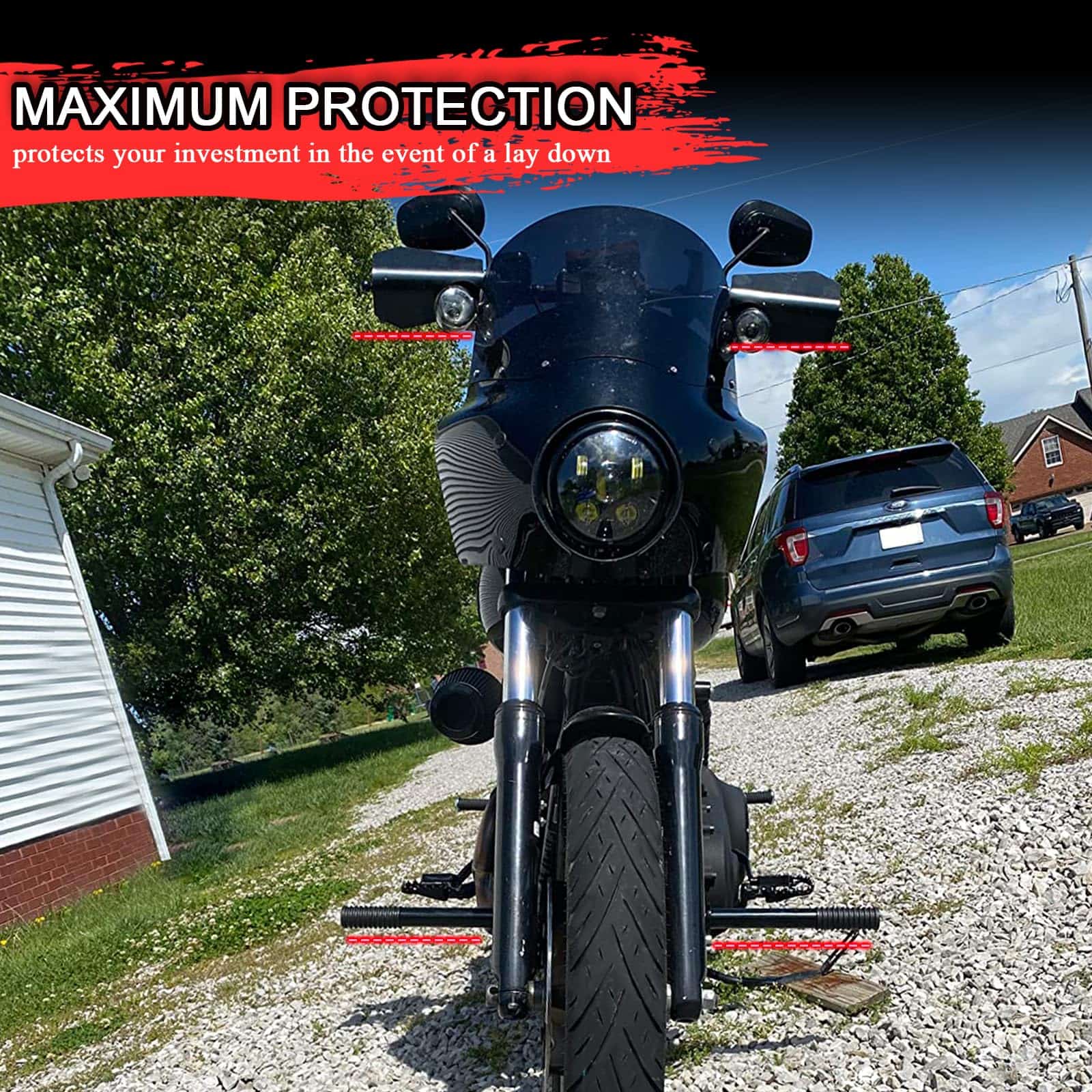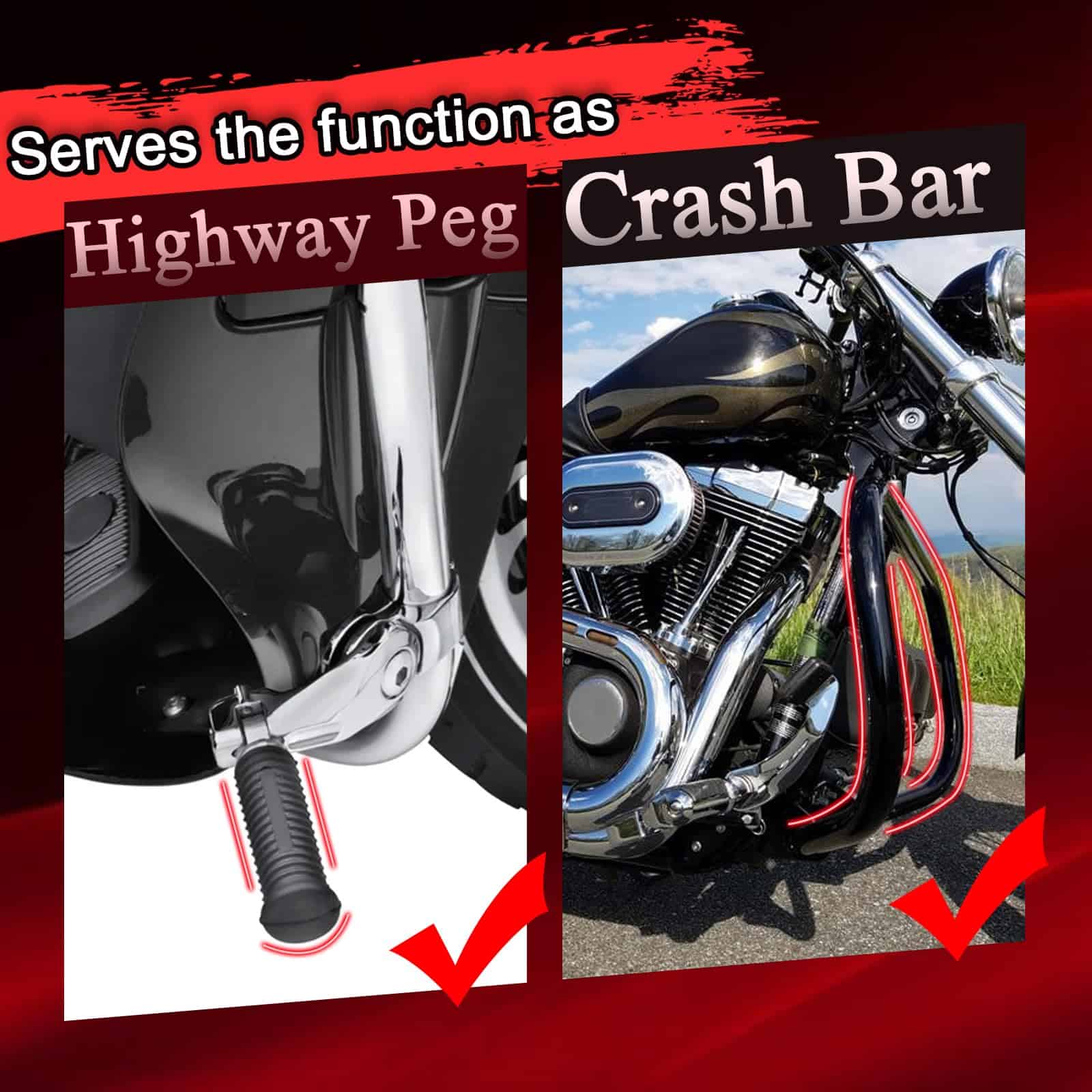 FOR MID CONTROL MODELS ONLY Front Highway Peg Crash Bar/Highway Footpegs Enginge guard for Harley Dyna with mid Control Models 2006-2017, for Street Bob FXDB/I Fat Bob FXDF Low Rider FXDL/I Wide Glide FXDWG/I. DUAL FUNCTIONALITY Serves as both a highway peg and a crash bar, providing comfort during long rides while also offering essential protection for your bike. MAXIMUM PROTECTION Protects the engine, frame, and other vital parts in the event of a tip-over or low-speed fall, minimizing damage and repair costs. REPLACEABLE SLIDERS Allows the bike to slide smoothly on the pavement instead of catching on it. HEAVY DUTY CONSTRUCTION Made from high-quality Iron. LENGTH Overall width of 32″ (same as most handlebar widths with grips installed), 1.25″ diameter tube. IN THE BOX Highway Peg Crash Bar And Required Hardwares. Order With Confidence WOWTK wants to make sure that all products meet your expectations both before and after installation. Contact our Customer Service Team who will be happy to take care of you regarding any questions you may have.