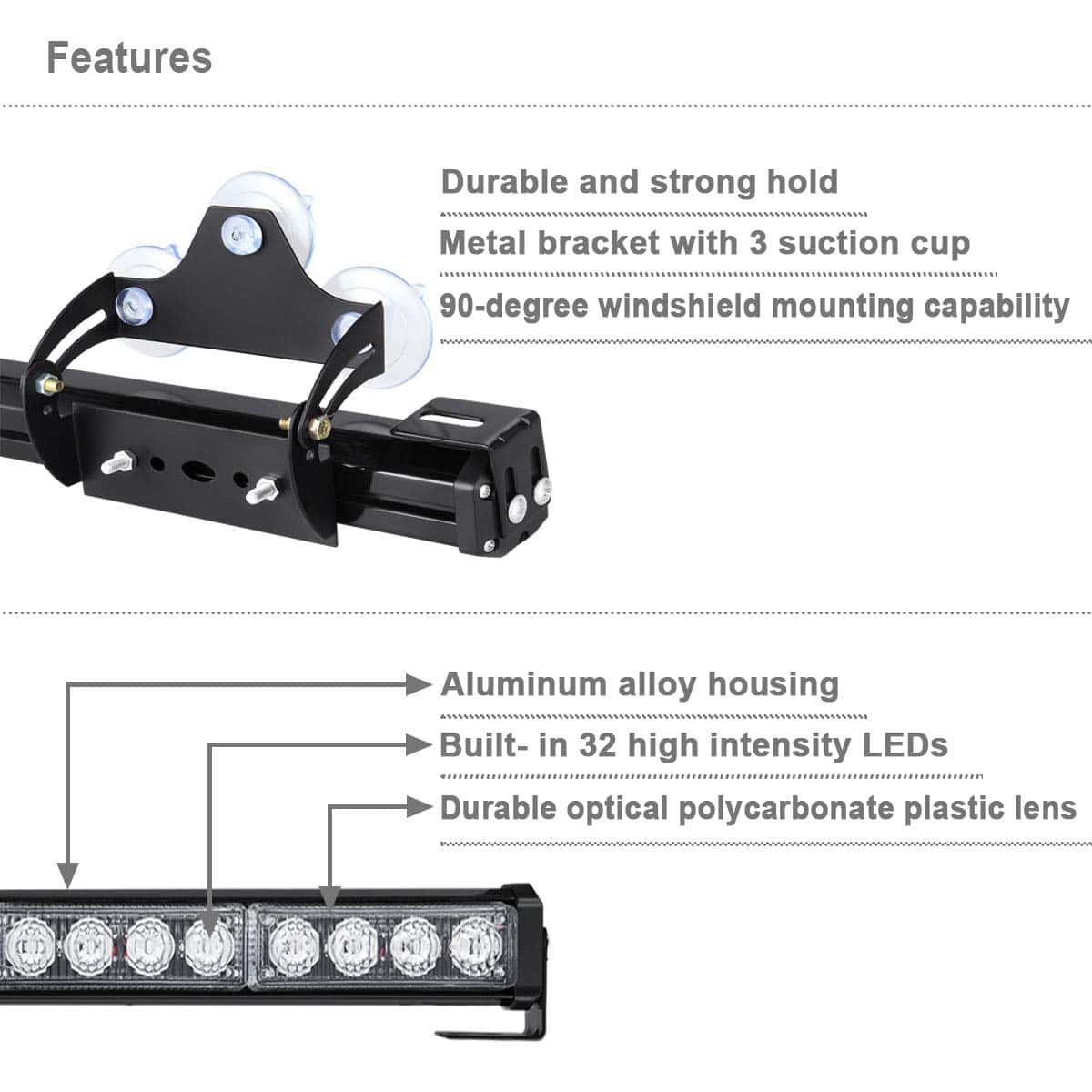1. Diseño de perfil bajo, carcasa de aluminio fundido con 32 LED rojos blancos de alta intensidad incorporados, presenta óptica de primera calidad que tiene potencia y brillo óptimos; ideal para aplicaciones frontales o traseras en vehículos para operar como un advisor de tráfico, luz de tablero o flash.