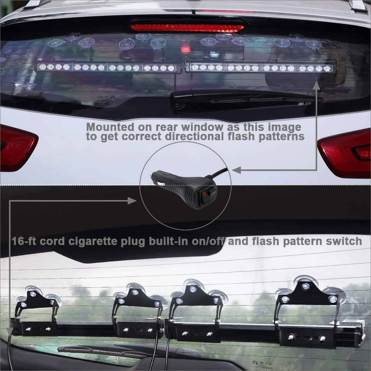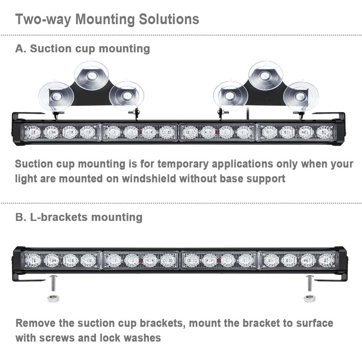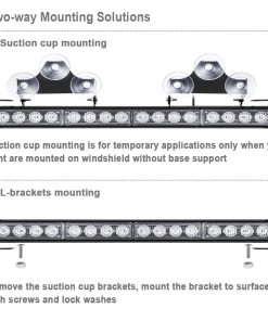 2. Las barras de luz multifuncionales vienen listas para instalar con soportes de montaje en forma de L y soportes de ventosa ajustables en ángulo de 90 grados, se pueden montar permanentemente con soportes en forma de L y tornillos, temporalmente mediante montaje de ventosas en parabrisas delantero o ventana trasera.
