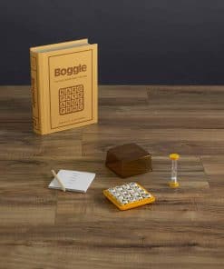 Boggle es un juego de palabras cronometrado en el que los jugadores tienen 3 minutos para encontrar tantas palabras conectadas como sea posible a partir de las letras mostradas en una cuadrícula de 16 cubos. Cuando se acaba el tiempo, los jugadores comparan sus listas de palabras y eliminan cualquier palabra que haya sido encontrada por varios jugadores. Se otorgan puntos por las palabras restantes, dependiendo de cuántas letras tenga la palabra. Cuando se publicó por primera vez por Parker Brothers en 1972, los jugadores debían configurar los 16 cubos de letras en una bandeja, cubrir la bandeja y luego voltear la bandeja y quitar la cubierta para revelar los cubos de letras. En 1976, Boggle fue rediseñado para incluir la icónica cúpula translúcida. Esto permitió a los jugadores agitar los cubos de letras antes de que comenzara cada juego, haciendo que la preparación del juego fuera tan emocionante como el juego en sí. Esta edición: Esta Edición Vintage de Boggle presenta gráficos y componentes inspirados en la edición de 1976, todo empaquetado en un elegante libro de lino. Contenido: Libro envuelto en tela con almacenamiento integrado, bandeja de cubos con cúpula translúcida, 16 cubos de letras, reloj de arena de 3 minutos, 2 lápices, reglas. El estuche de librero mide 10.63 x 8.50 x 2.63 pulgadas y pesa 1.75 libras con todos los componentes del juego almacenados en su interior. Oficialmente licenciado por Hasbro. Diseñado en Massachusetts. Producido en China. Adecuado para 2 a 6 jugadores, mayores de 8 años.