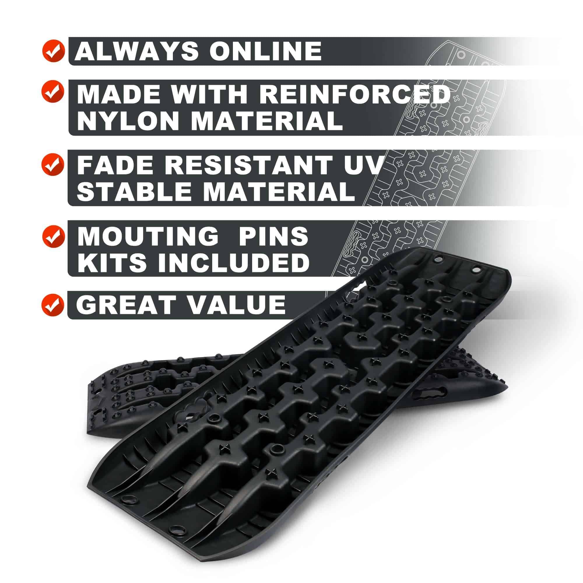 5. Fabricado en nylon reforzado con fibra de ingeniería. La construcción liviana, duradera y resistente de plástico de polipropileno de alto impacto hace que estos sean duraderos mientras son resistentes a los rayos UV y a la corrosión. Las tablas todoterreno X-BULL pueden soportar hasta 10 toneladas. Nos doblamos 90 grados y no se romperán.