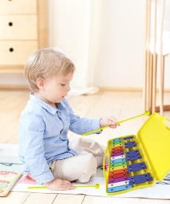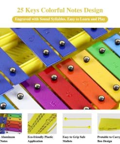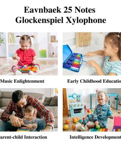 Xilófono Eavnbaek de 25 Notas Glockenspiel Xilófono para Niños, Instrumento de Percusión Profesional con Estuche Rígido y Mazos Seguros, para Estudiantes Principiantes, Enseñanza de Música y Regalos. Nuestros xilófonos están hechos de material de alta calidad. Las 25 notas coloridas están hechas de aluminio, que son ligeras pero firmes. El estuche rígido y los mazos están hechos de plástico ABS, que son respetuosos con el medio ambiente y sin sabor. La precisión de la afinación del xilófono para niños tiene 25 notas, 15 notas coloridas con 2 octavas completas, de G a G tono claro, brillante y preciso que proporciona una amplia gama de sonidos musicales. Los mazos fáciles de sostener permiten que los niños usen el xilófono de forma sencilla y mejoren su habilidad en el control de las manos. El diseño amigable para los niños de las teclas de metal de colores arcoíris de 25 notas del glockenspiel puede ayudar mejor a los niños a distinguir los tonos según el color, estimular el desarrollo visual de los niños. La versatilidad del xilófono de 25 notas nos permite llevarlo a todas partes con un aspecto de maletín, permitiéndole llevarlo con facilidad. Además, los 3 soportes retráctiles en la parte posterior del tablero permiten que el xilófono se pueda utilizar en más superficies y ofrece el ángulo perfecto para que los niños puedan componer música hermosa. El sonido de este xilófono es claro y agradable. Tocar el glockenspiel puede cultivar la coordinación entre la vista y la mano de los niños y ayudarles a experimentar la diversión de la música. Muy adecuado para el aprendizaje escolar y el entretenimiento, que se adapta a una amplia gama de edades, desde niños pequeños hasta niños en edad escolar.