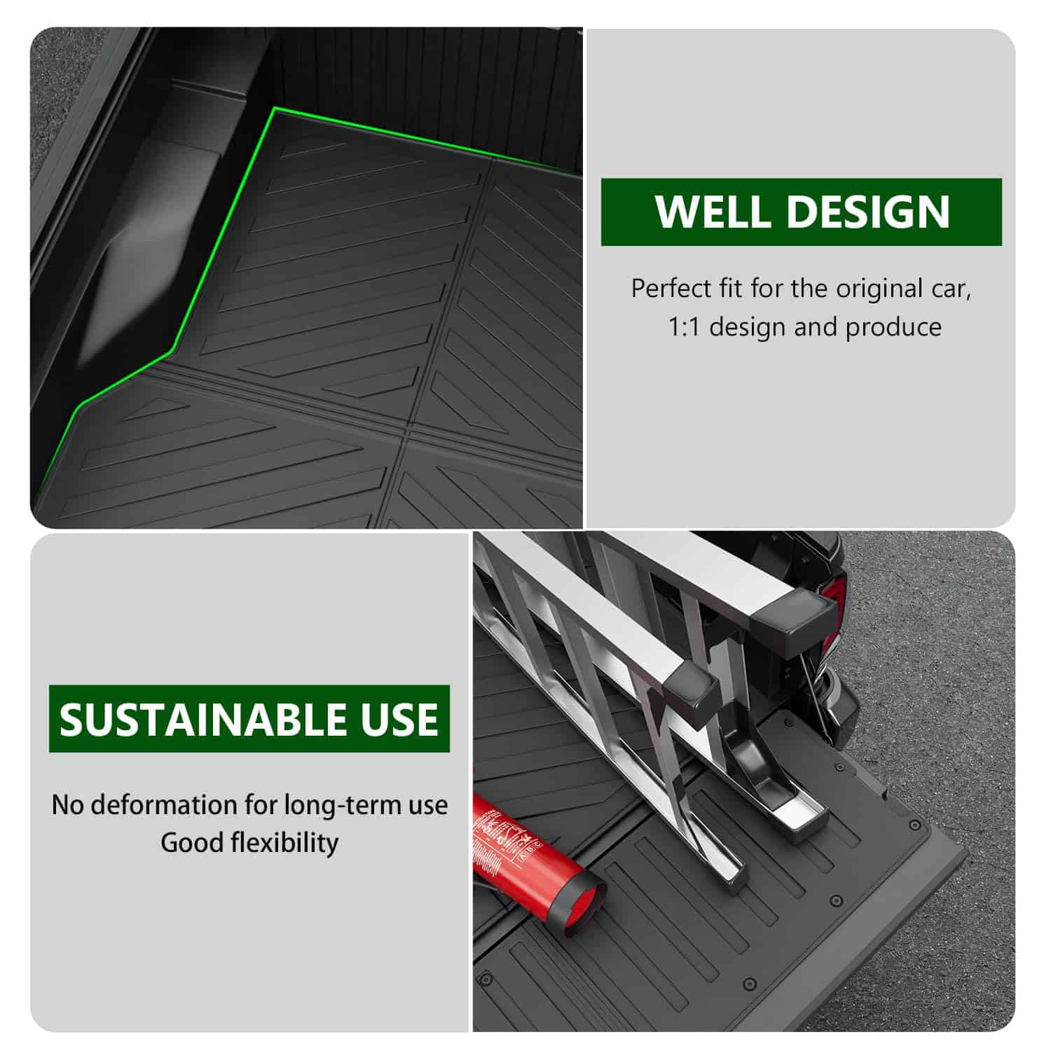 2. Material de Calidad Premium: Nuestro forro de cama y mat de la puerta trasera están hechos de material de TPE de calidad premium que es resistente al agua, resistente al desgaste y flexible. Sin mal olor, por lo que puede estar seguro de usarlo, y tiene una larga vida útil.