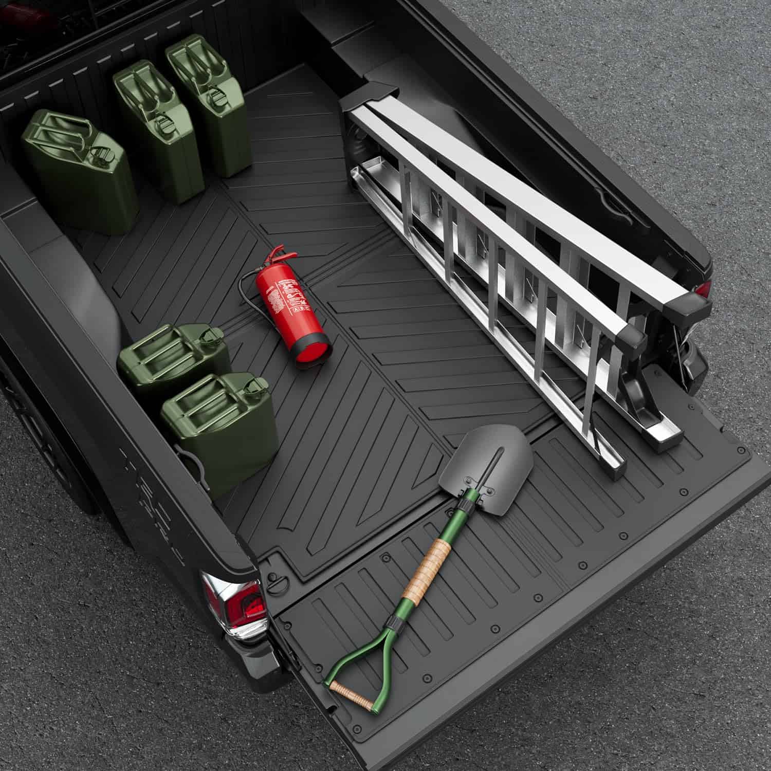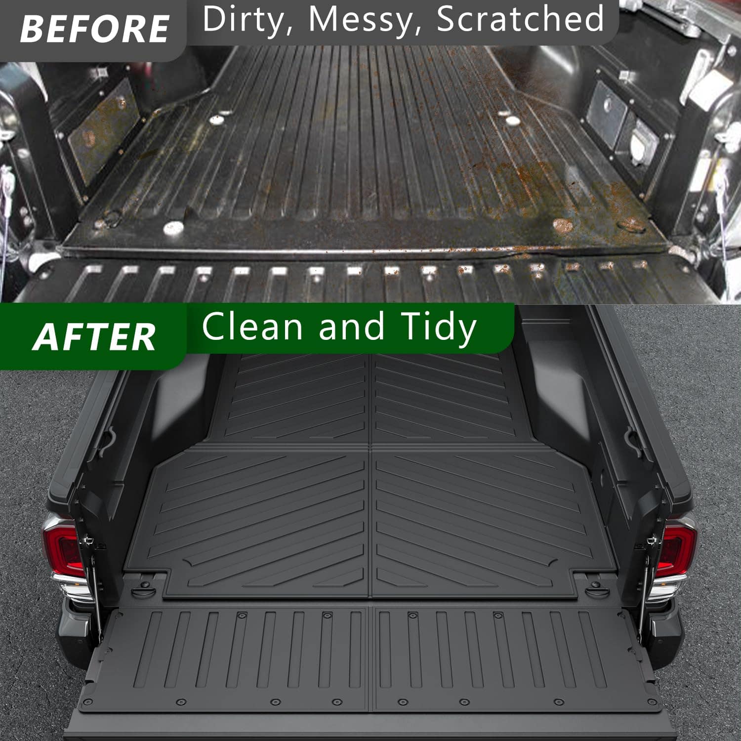 3. Función Práctica: El protector de carga y mat de la puerta trasera cubren la desordenada cama del camión y le dan a su automóvil una nueva apariencia. Protegerán la parte trasera del camión y la puerta trasera del sucio, los arañazos y el desgaste. Su superficie antideslizante puede evitar que los objetos se deslicen en el camión y los mats no son fáciles de raspar. Cuando la puerta trasera se utiliza como banco de trabajo, la protección será buena. Se pueden limpiar directamente con agua después de usar.