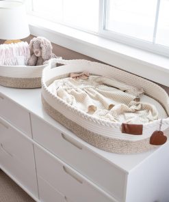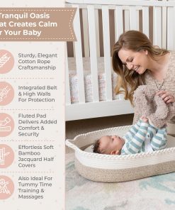 1. FAMILIAS UNIDAS EN AMOR POR ESTE ELEMENTO ESENCIAL DE NUEVOS PADRES: Esta canasta de cuerda de algodón reforzado para bebés es el refugio perfecto para cambios de pañales, tiempo boca abajo y masajes relajantes; Nuestras cunas de moisés portátiles garantizan que su pequeño permanezca acogedor y protegido de superficies frías y duras, brindándole tranquilidad dondequiera que vaya. 2. EL EQUILIBRIO PERFECTO ENTRE COMODIDAD, FUNCIONALIDAD Y ESTILO: La canasta de guardería de 30″L por 17″W por 6»H cuenta con un cinturón de seguridad seguro y una suave almohadilla de espuma PU que acuna la espalda de su bebé; Además, la cesta de almohadilla cambiante para bebé incluye una cubierta extra de jacquard de bambú impermeable y lujosamente suave. 3. APRECIA HOY, ATESORA MAÑANA: La cesta de tapa de mesa cambiadora cuenta con asas resistentes, una construcción de cuerda de algodón de alta elasticidad reforzada y un elegante acabado en crema con líneas negras, todas intrincadamente trenzadas en la parte superior para un toque de belleza atemporal; Está diseñada para resistir la prueba del tiempo como una preciada joya o un tesoro heredado para pasar de generación en generación. 4. VIENE CON UNA CANASTA DE PAÑALES COORDINADA: Así es, también incluimos un conveniente organizador de pañales con la cesta de la estación de cambio portátil; Respire tranquilo sabiendo que la cesta de cambio de bebé y la cesta de pañales cumplen con las regulaciones de la CPSC federales en los EE. UU. y están completamente certificadas por un laboratorio independiente. 5. HECHO CON AMOR, PARA SU AMADO: También somos padres y armamos este kit de estación de cambio de pañales para aligerar la carga para los nuevos padres; Estamos orgullosos de la calidad de estos productos para bebés y respaldamos cada uno con una Promesa de Reemplazo de por Vida.