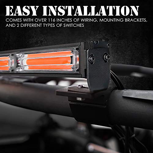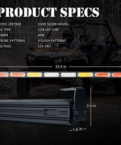 b Features: r Block 1, 2, 7 & 8 Running and Stop Lights, Block 3 & 6 are Strobe Lights, Block 4 & 5 are Solid or Reverse Light br Running and Stop Lights, Reverse Light, and Amber Strobe Functions br Amber Strobe Lights have 9 Different Patterns including Solid Light br Independently Control Brake Light, Reverse Light, and Strobe Patterns br Brighter and more effective than standard LED strobe lights br 2 Types of switch controls included br Amber Strobe Patterns include Solid, Alternating Fast and Slow, etc. br Universal for all vehicles with a 12V power source br br b Specs: r LightBar Dimensions: 35.4″ x 2.4″ br Cord length: 116″ (From lightbar to end of wire) br Number of modes: 7 (amber lights only) br Number of LED blocks: 8 br LED Type: COB br br b Note: r Brake & Turn Signal functions may require relays to work properly (Not Included due to Universal Fitment) br Professional Installation Recommended br 4 Door Models may require an extension cable br br b Package Includes: r 1 x Strobe Lightbar br 1 x Wiring Harness br 2 x Types of switch controls br Instructions