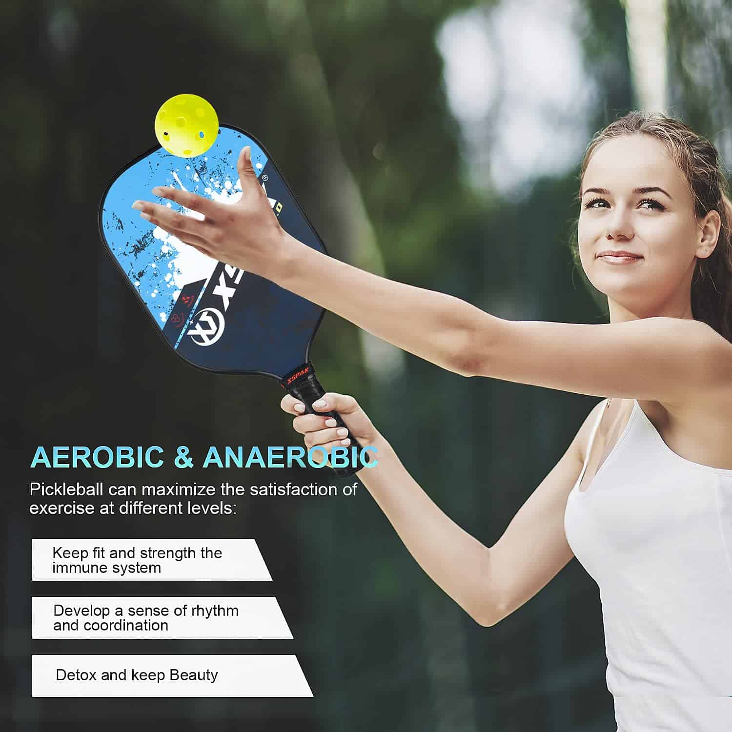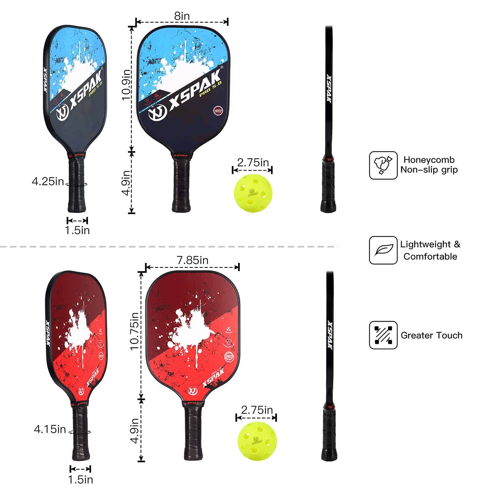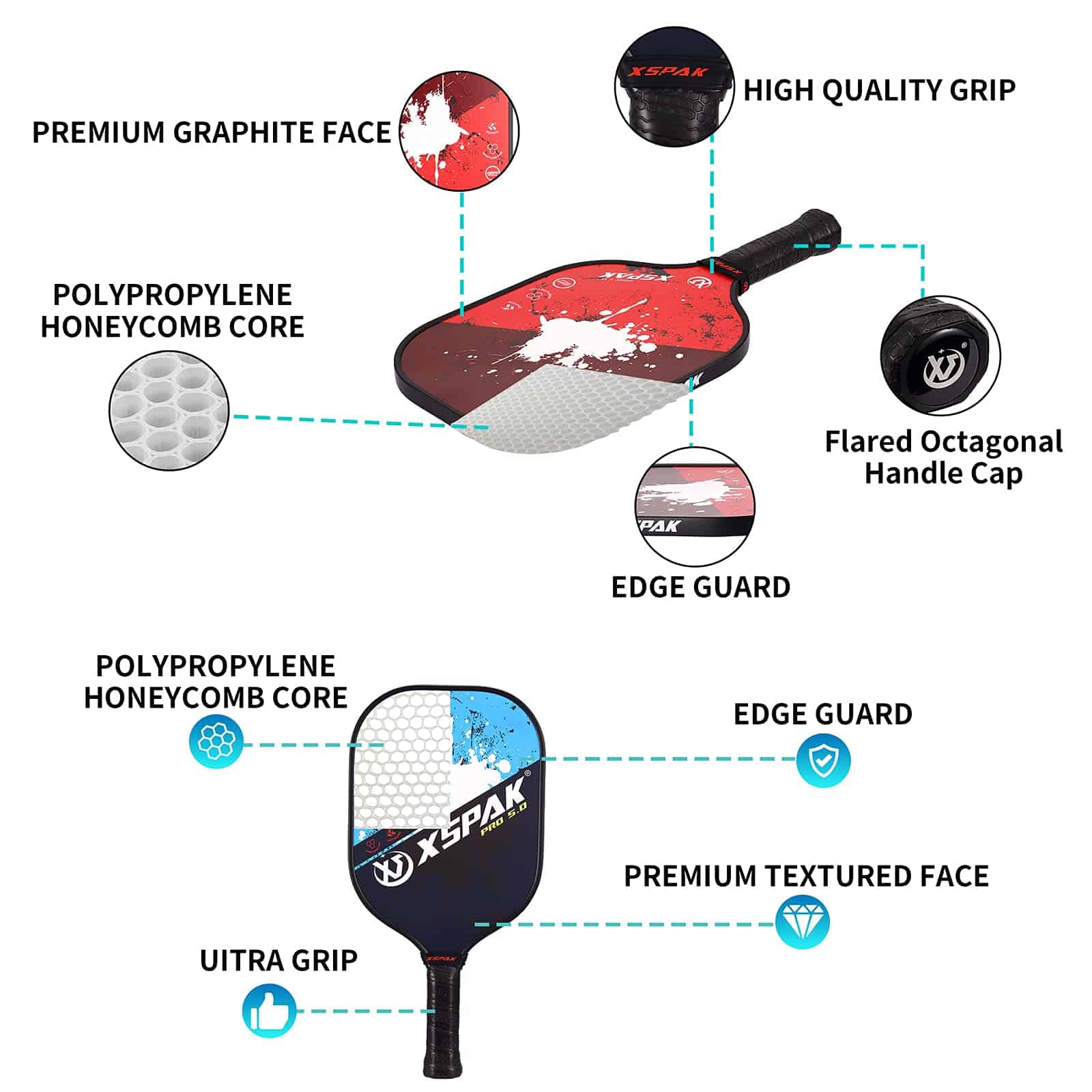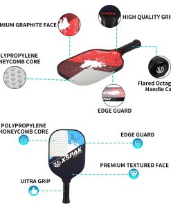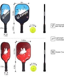 1. Oferta todo en uno: Set de Pickleball de 2 palas Premium de Grafito Artesanal y 2 palas de Fibra de Vidrio y 2 pelotas de pickleball para exterior y 2 pelotas de pickleball para interior y 1 bolsa de pickleball portátil. La bolsa de pickleball es portátil y conveniente para transportar y almacenar tus palas y pelotas de pickleball. 2. Cara para un poder de tiro decente: Cara de fibra de Grafito Premium que brinda control preciso a la pelota para mayor precisión; Fibra de Vidrio confiable – Las palas de pickleball compuestas suelen ser más ligeras que las palas de pickleball de madera o polímero. 3. Distribución uniforme para el núcleo de panal interno: Las palas de paddleball XS XSPAK estándar USAPA están construidas con núcleo de polímero de panal, que está intercalado entre dos láminas de Grafito Premium duradero; El núcleo de panal de polipropileno y la cara de fibra de vidrio son una combinación muy buena que permite un excelente poder y control. 4. Agujeros perforados con precisión hacen que las pelotas de pickle entreguen un camino de vuelo perfecto: Las pelotas se pueden usar para el juego pro más agresivo y minimizar la interferencia del viento. El rebote perfecto y la durabilidad notable hacen que estas pelotas de pickle sean la mejor opción principal para cualquier nivel de juego de campeón. 5. Agarre Premium, Tamaño de Mango Perfecto: Las palas de pickleball XS XSPAK son cómodas de manejar y funcionan bien durante el juego; El juego de pickleball profesional estándar USAPA está perforado, absorbe el sudor y está acolchado, para permitir un mejor agarre de la pala. Tener una pala de pickleball compuesto de alta calidad puede transformar por completo tu juego.