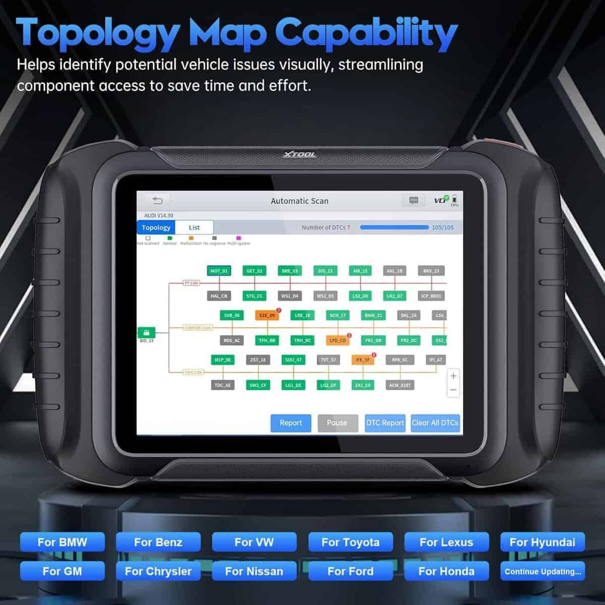 4. Herramienta de Escaneo de Mapeo de Topología: XTOOL D8W es un escáner de diagnóstico de automóviles con topología indispensable para solución de problemas rápidos. Cuenta con capacidad de Mapeo de Topología, mostrando todos los módulos con una estructura de topología de color y permitiendo la rápida identificación de fallas a simple vista. Es comparable a otras herramientas de escaneo de $1,200 a $2,000 en el mercado. Además, aumenta la eficiencia de diagnóstico en un 60%, satisfaciendo las necesidades de mecánicos automotrices, concesionarios y aficionados al bricolaje. Actualmente disponible para GM, Ford, Toyota, Honda, Nissan, BMW, Benz, Hyundai, VW, Lexus, Chrysler, etc., decenas de marcas. Experimenta diagnósticos de grado profesional y aumenta tu eficiencia de reparación.