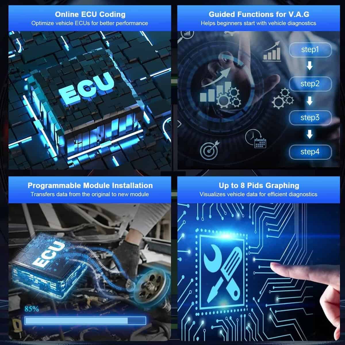 7. Codificación Avanzada de ECU y Configuración de ECU y Funciones Guiadas para VAG y PMI: El avanzado escáner automotriz XTOOL D8W soporta Codificación de ECU para VW, Audi, Skoda, Benz, BMW y Mitsubishi, permitiendo personalización como desactivar zumbadores de cinturones y mejorar el rendimiento del vehículo. También cuenta con Funciones Guiadas para VAG, ofreciendo asistencia paso a paso. Además, PMI (Instalación de Módulo Programable) para Ford, Lincoln y Mazda permite una fácil instalación de datos de módulo para reemplazos, asegurando una transferencia de datos precisa a los nuevos módulos. Nota: Por favor, verifica la compatibilidad con VIN antes de la compra.