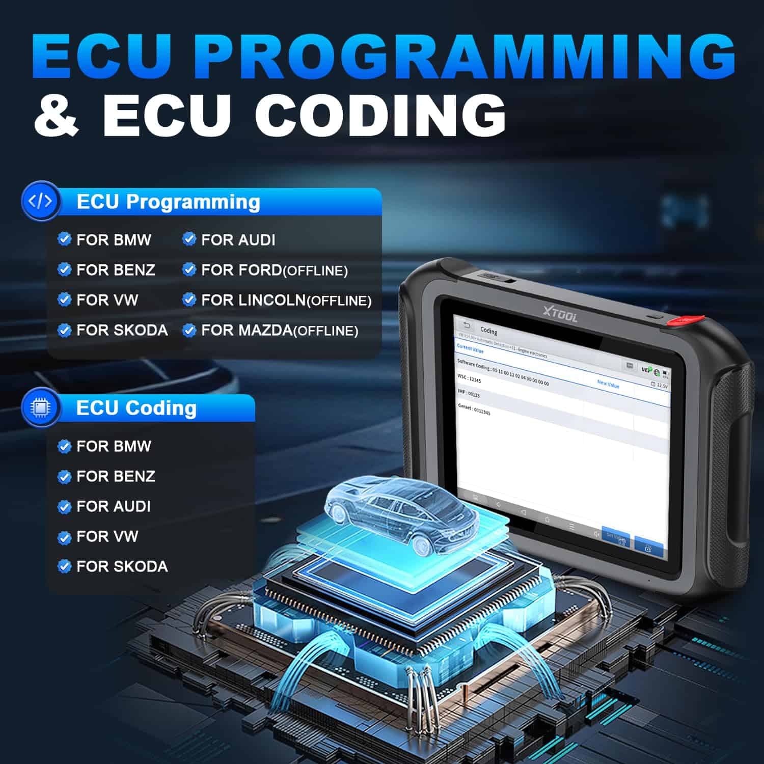 4. Codificación Avanzada de ECU y Programación de ECU: Función Guiada para Guías de Códigos de Falla de V.A.G & BMW, Herramienta de diagnóstico automotriz de elección para propietarios de vehículos GM, Ford, el escáner de programación de ECU XTOOL D9SPro ofrece codificación de ECU y programación de ECU para BMW/para Benz/para VW/para Audi/para Skoda, asegurando un emparejamiento de ECU sin problemas, codificación de ECU, programación de ECU y configuraciones personalizadas del automóvil. Con Funciones Guiadas, el escáner OBD2 XTOOL D9S PRO con codificación de ECU puede hacer diagnósticos y mantenimiento sin esfuerzo. Además, es capaz de Programación Offline para vehículos Ford/Lincoln, facilitando actualizaciones de software/firmware de ECU, programación de nuevos módulos, etc.