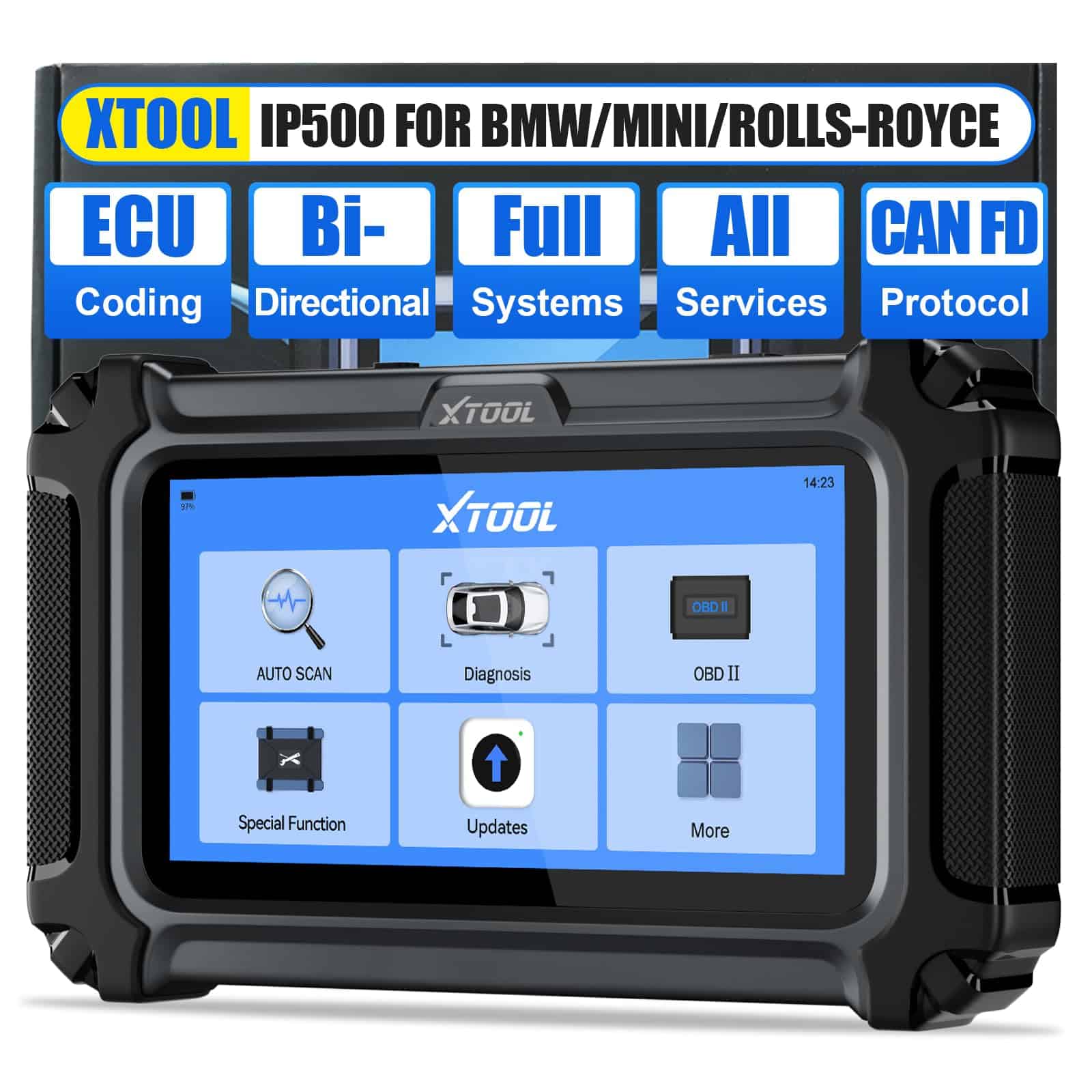 2. XTOOL IP500-La Herramienta de Diagnóstico Definitiva para Propietarios de BMW/MINI/Rolls-Royce XTOOL IP500 para BMW ofrece acceso profundo a todos los sistemas y diagnósticos precisos que las herramientas generales no pueden igualar. Con sus funciones especializadas, los propietarios de BMW ya no tienen que preocuparse por funciones irrelevantes o problemas de compatibilidad. Su pantalla táctil HD de 5» y 23 Funciones Únicas ofrecen una experiencia de diagnóstico sin interrupciones, también incluye otras funciones avanzadas: Codificación de ECU, 10 Funciones OBD2 Completo, Control Bidireccional Completo, Gráficos de Datos en Vivo Multi-en-Uno, Diagnóstico Completo del Sistema, VIN Automático, Leer Información de la ECU, Leer Fotogramas Congelados, Flujos de Datos, Actualización de por Vida, etc.