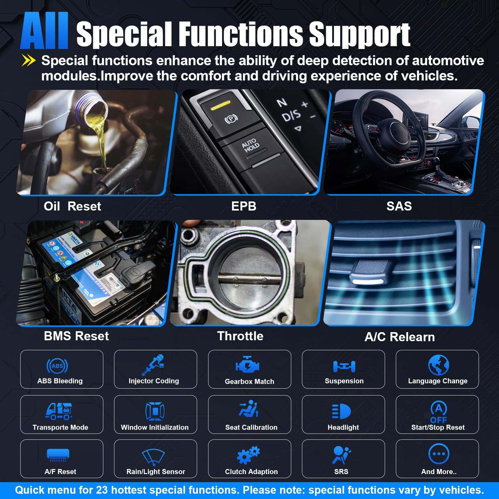 3. 23 Funciones Especiales para BMW XTOOL IP500 para BMW es una herramienta de diagnóstico OBD2 especialmente equipada con 23 funciones únicas para BMW que le ayudarán a manejar sin esfuerzo la mayoría de los trabajos de mantenimiento diario y a ahorrar una cantidad significativa de costos de diagnóstico en los concesionarios. Las funciones incluyen Restablecimiento de EPB, Restablecimiento de SAS, Restablecimiento de BMS, Restablecimiento de Acelerador, Sangrado de ABS, Codificación de Inyectores, Ajuste de la Caja de Cambios, Ajuste de Suspensión, Cambio de Idioma, Calibración de Asientos, Ajuste de Faros, SRS, Restablecimiento A/F, Reaprendizaje del A/C, Sensor de Lluvia/Luz, Adaptación del Embrague, etc.