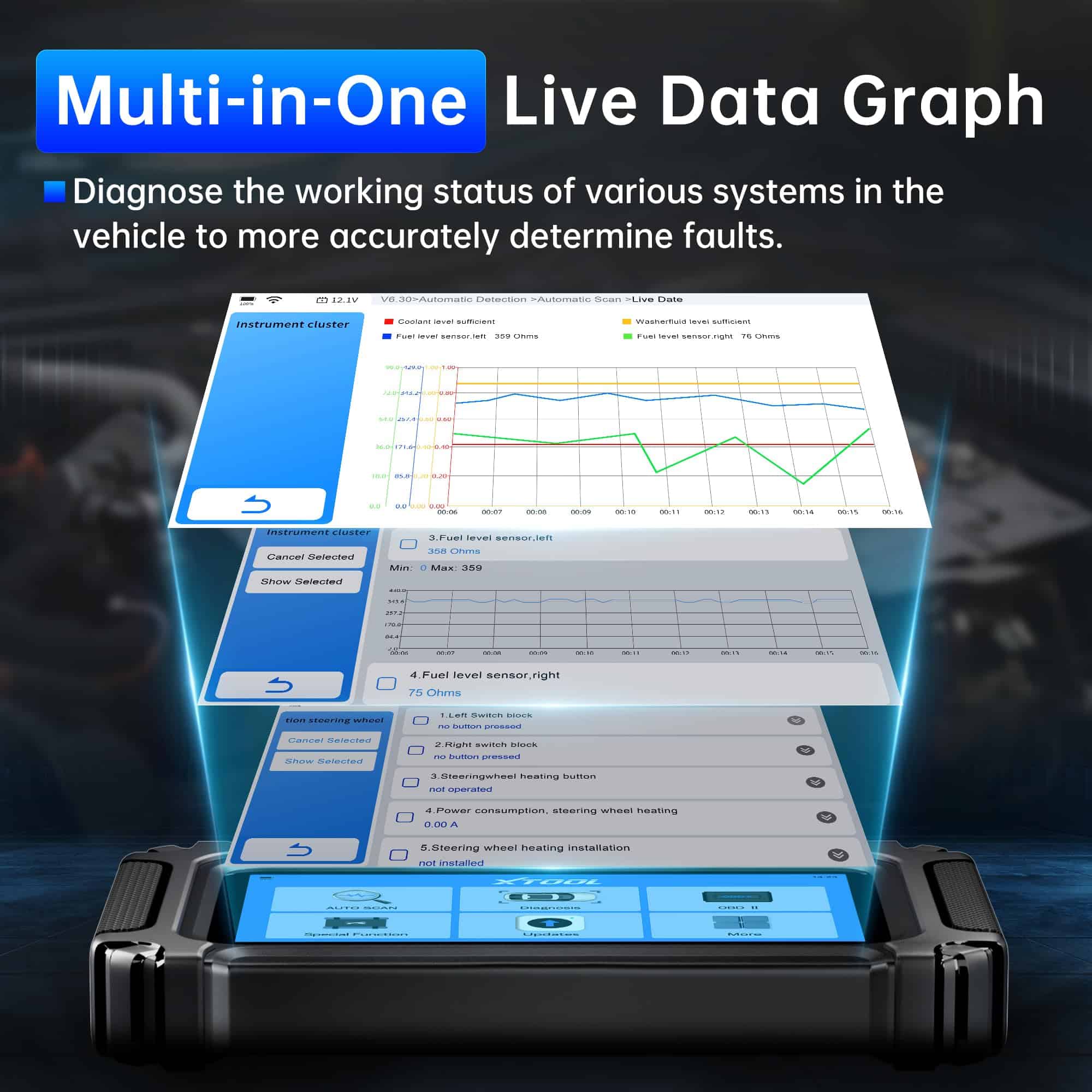 6. Escaneo Automático Profundo-Gráfico de Datos en Vivo Multi-en-Uno Este lector de códigos XTOOL IP500 para BMW puede realizar un escaneo profundo automático de todos los sistemas del vehículo de BMW y al mismo tiempo monitorear múltiples tipos de datos en tiempo real, lo que le permite ver claramente e intuitivamente las correlaciones de datos entre varios sistemas y analizar la condición operativa general del vehículo en profundidad, permitiéndole detectar problemas ocultos y posibles riesgos de falla para garantizar que su vehículo esté en buen estado de funcionamiento.
