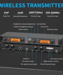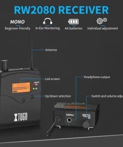 XTUGA RW2080 Sistema de Monitor Inalámbrico de Todo Metal en Oreja 2 Canales 24/6/8 Bodypack de Monitoreo br br El panel de visualización LCD muestra claramente el estado de funcionamiento br Cuerpo de recepción de metal Bodypack br Recordatorio de batería baja de los receptores Bodypack br 2 controles de interruptor de encendido br Tiene un soporte en ambos lados de la máquina, fácil de configurar Fuerte señal, frecuencia UHF br Tecnología de bloqueo de tono digital para evitar posibles interferencias br 40 canales preestablecidos separados por 4 grupos, ajustables br Distancia efectiva: 150 m br Salida de audio: mono br br Especificación: br Transmisor br Especificación de la caja: estándar 1U br Material de la carcasa: panel de metal br Modo de oscilación: PLL sintetizado br Estabilidad de frecuencia: 0.005% br Rango de frecuencia: 902-928 MHz br Intervalo de frecuencia: 32 MHz br Canal preestablecido: 40 canales separados establecidos en 4 grupos br Modo de funcionamiento: ajuste manual br Máxima desviación: 48KHz br Respuesta de frecuencia: 50Hz~15KHz 3dB br Potencia de salida de transmisión: 100mW(50 ) br Radiación armónica: 4NW br Entrada AF: XLR, jack de 6.35 mm br Impedancia de carga de auriculares: 16 br Consumo de corriente: DC 12V/250mA br Enchufe de la antena: conector TNC(50 ) br br Receptor: br Modo de oscilación: PLL Sintetizado br Rango de frecuencia: 902-928 MHz br Canal preestablecido: 40 canales separados establecidos en 4 grupos br Modo de funcionamiento: ajuste manual br Modo de recepción: sintonización única br Sensibilidad: desviación 25 khz, con 7dBuV de conexión, S/N 78dB br Máxima desviación: 48KHz br T.H.D. completo: 94db(1KHZ-A) br Respuesta completa: 50Hz~15KHz 3dB br Potencia de salida:(32 )2x35mw@1KHz br Impedancia de carga de auriculares: 16 Salida de conector: toma de auriculares estéreo de 3.5mm Ajustes de salida de volumen: ajuste al usar Caja de alimentación: baterías AAX2 Consumo de corriente: 3V/120mA(Bajo los grados mediantes del control de volumen) br br Paquete Incluido(Sistema completo): br Transmisor 1 br Receptor Bodypack(con auriculares) 2/4/6/8 br Antena 2 br Cable de línea 4 br Adaptador de corriente 1 br Manual de Usuario 1
