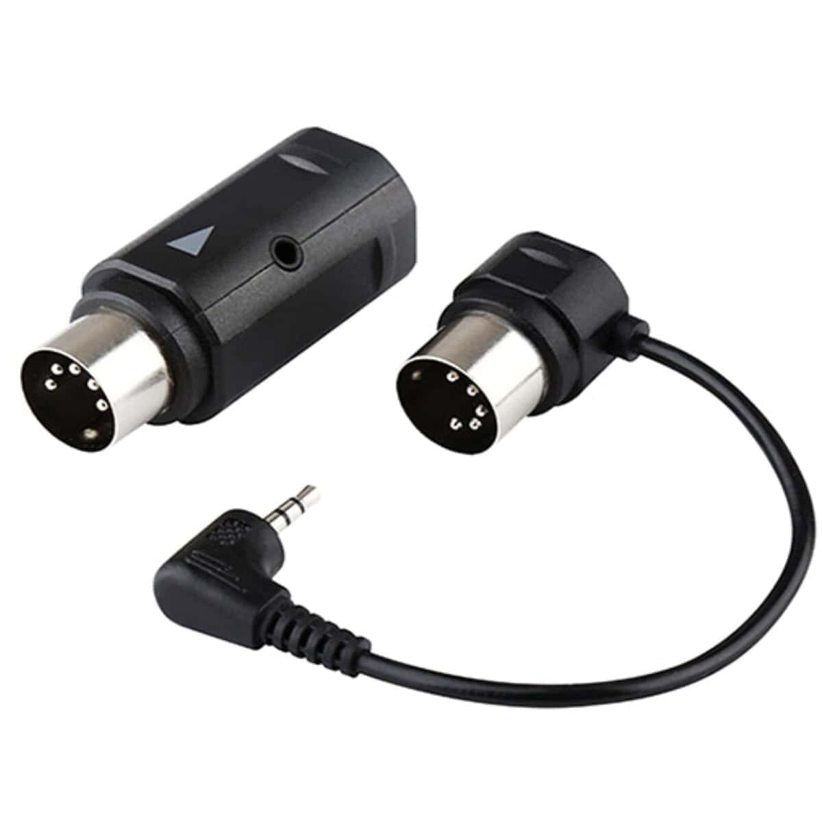 4. Cómo usar: MD1 agrega transmisión y recepción inalámbricas de MIDI Bluetooth a equipos de música con conectores MIDI DIN. Este producto consta de dos partes: uno es el adaptador principal, que se utiliza para obtener energía del conector MIDI OUT DIN y enviar o recibir mensajes MIDI de forma inalámbrica. El otro es un subadaptador, que se utiliza para transmitir mensajes MIDI al conector MIDI IN DIN del dispositivo MIDI.