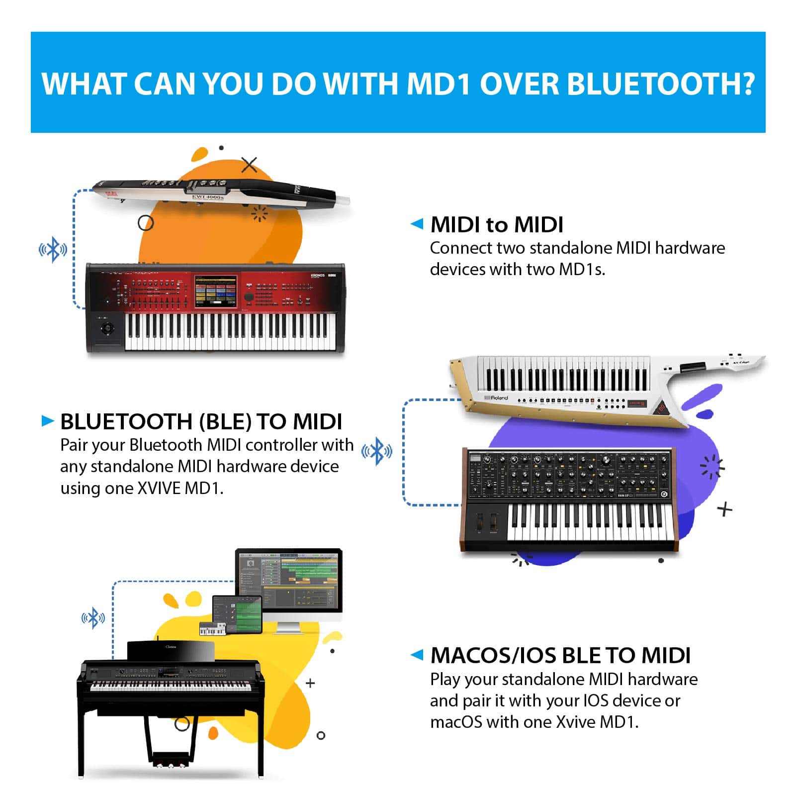 1. Adaptador MIDI inalámbrico: ¡Simplemente reemplaza tus cables MIDI con Xvive MD1 y disfruta de tu libertad inalámbrica! No necesita una instalación de controladores complicada, verdaderamente enchufar y usar. ¡Emparejamiento automático con cualquier dispositivo Bluetooth MIDI! MD1 se conecta a dispositivos y computadoras con una función MIDI BLE integrada, como controladores MIDI Bluetooth, iPhones, iPads, computadoras Mac, etc.
