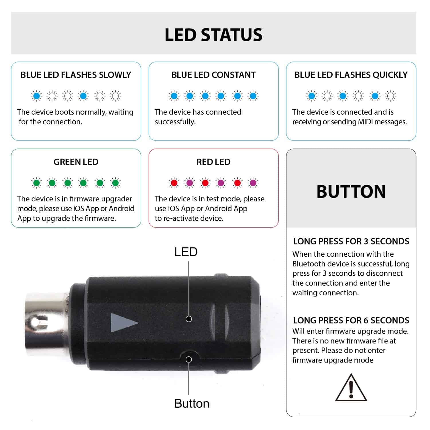 5. Estable y garantía: MIDI sobre Bluetooth Low Energy-Compliant, tan bajo como 3 ms (prueba con dos MD1 en BLE 5) Chip FTP GRAET de alto rendimiento para garantizar la transmisión de datos MIDI rápida y estable. y garantía de 365 días.
