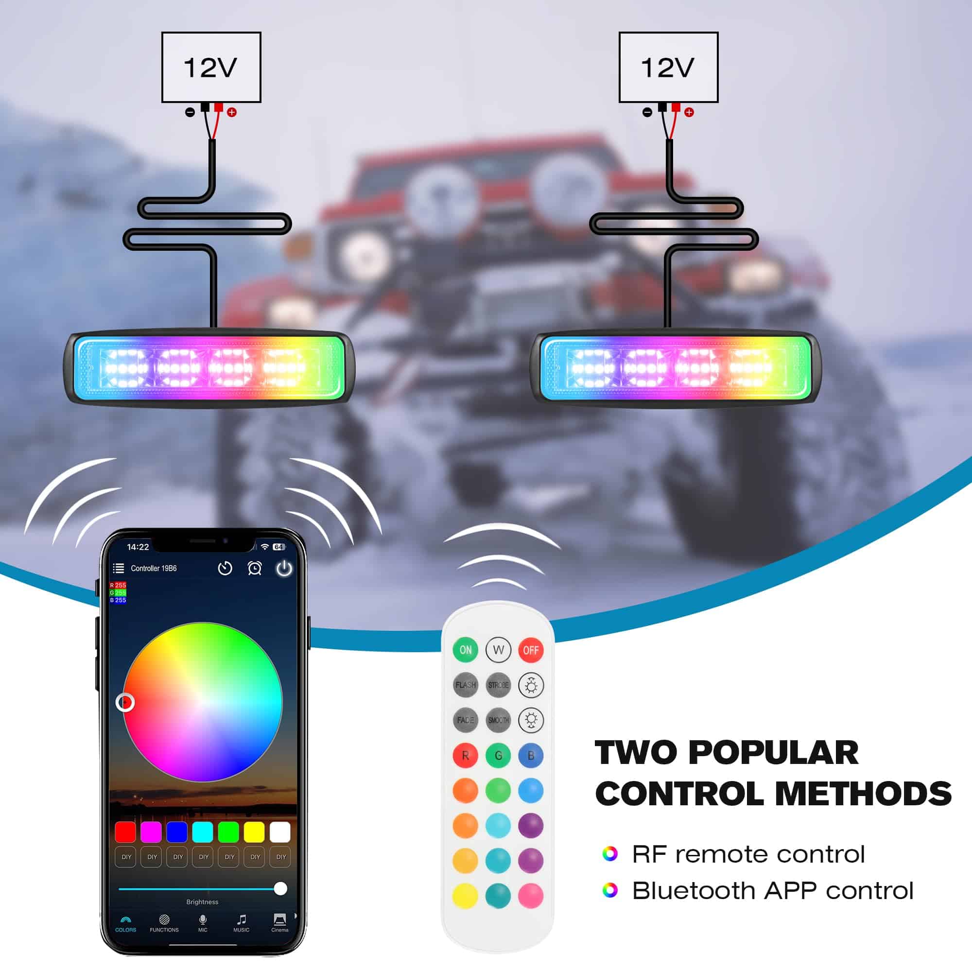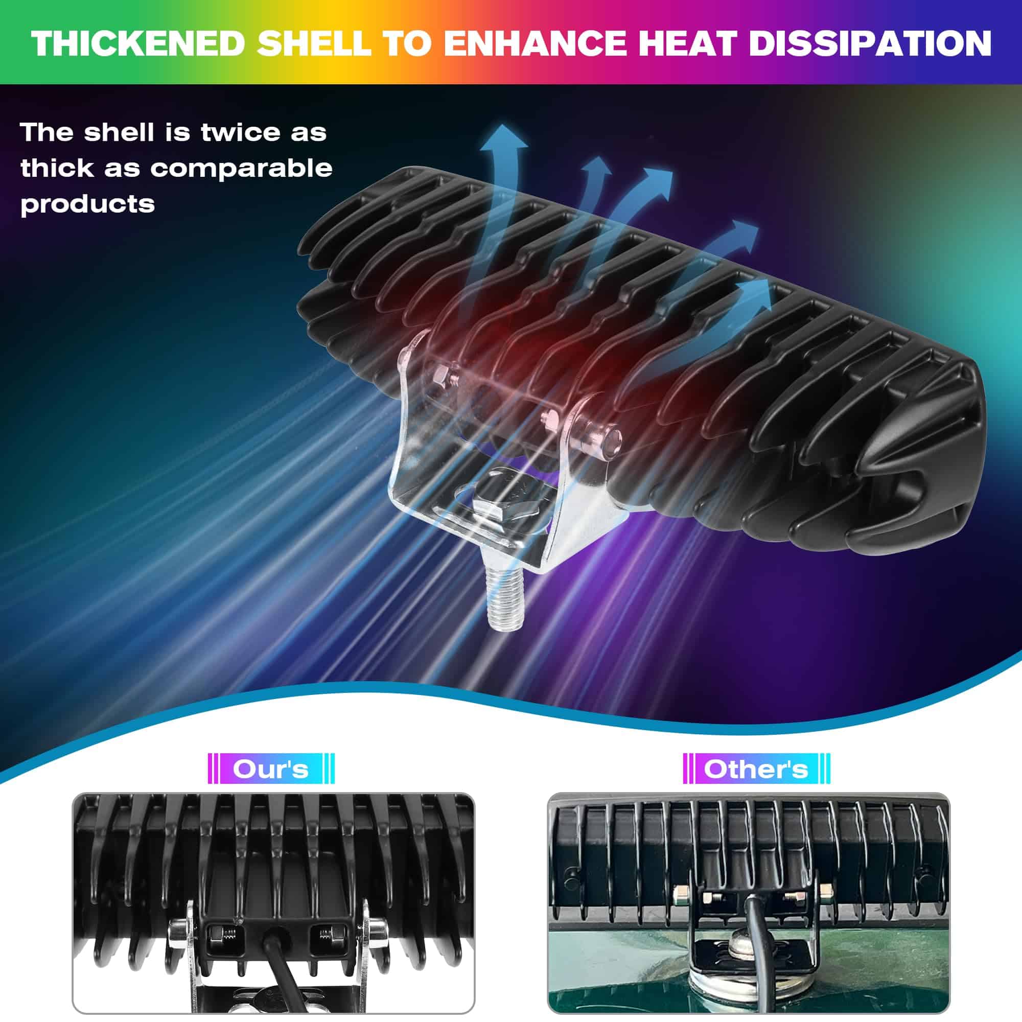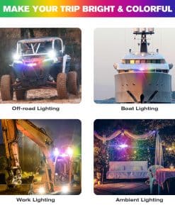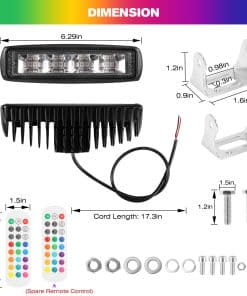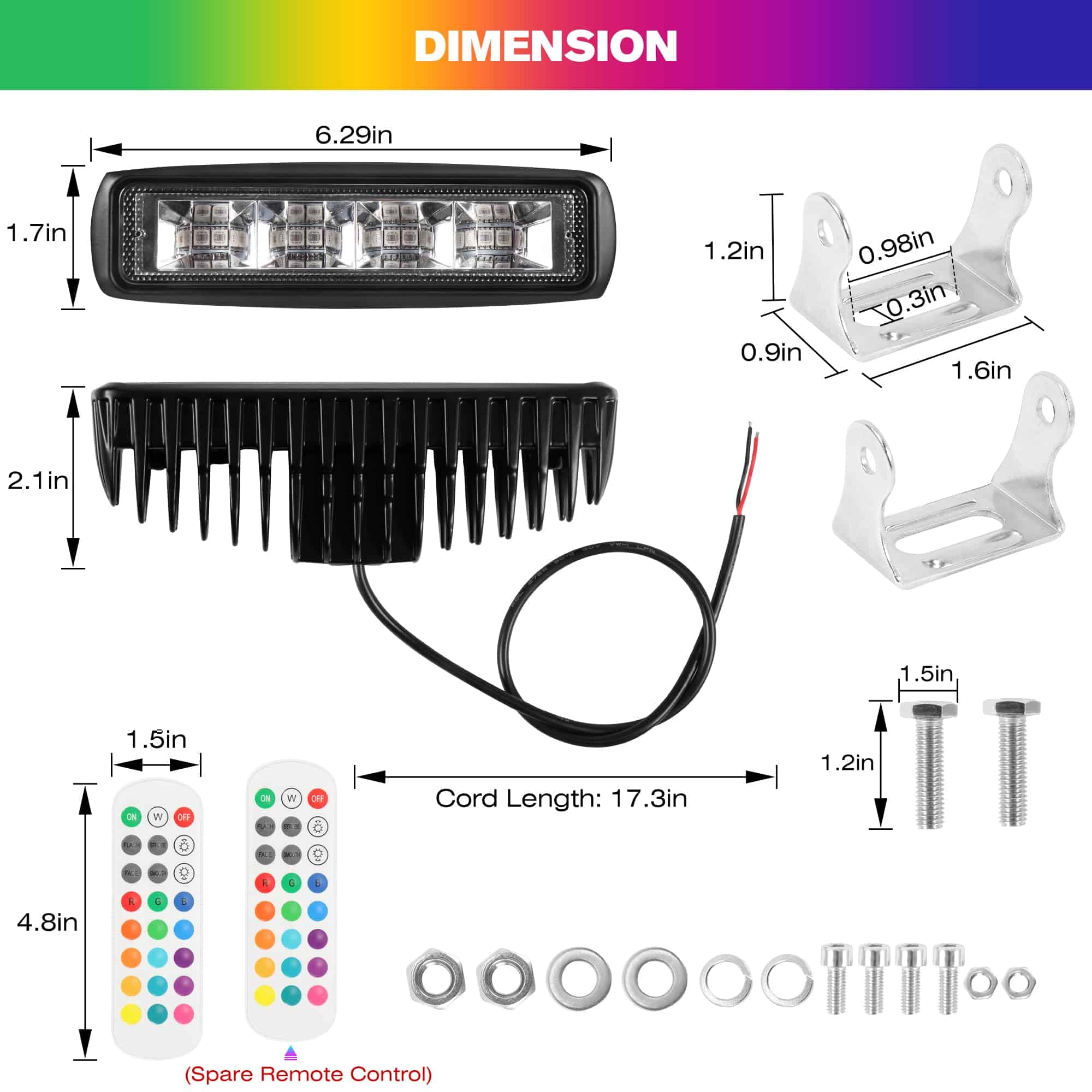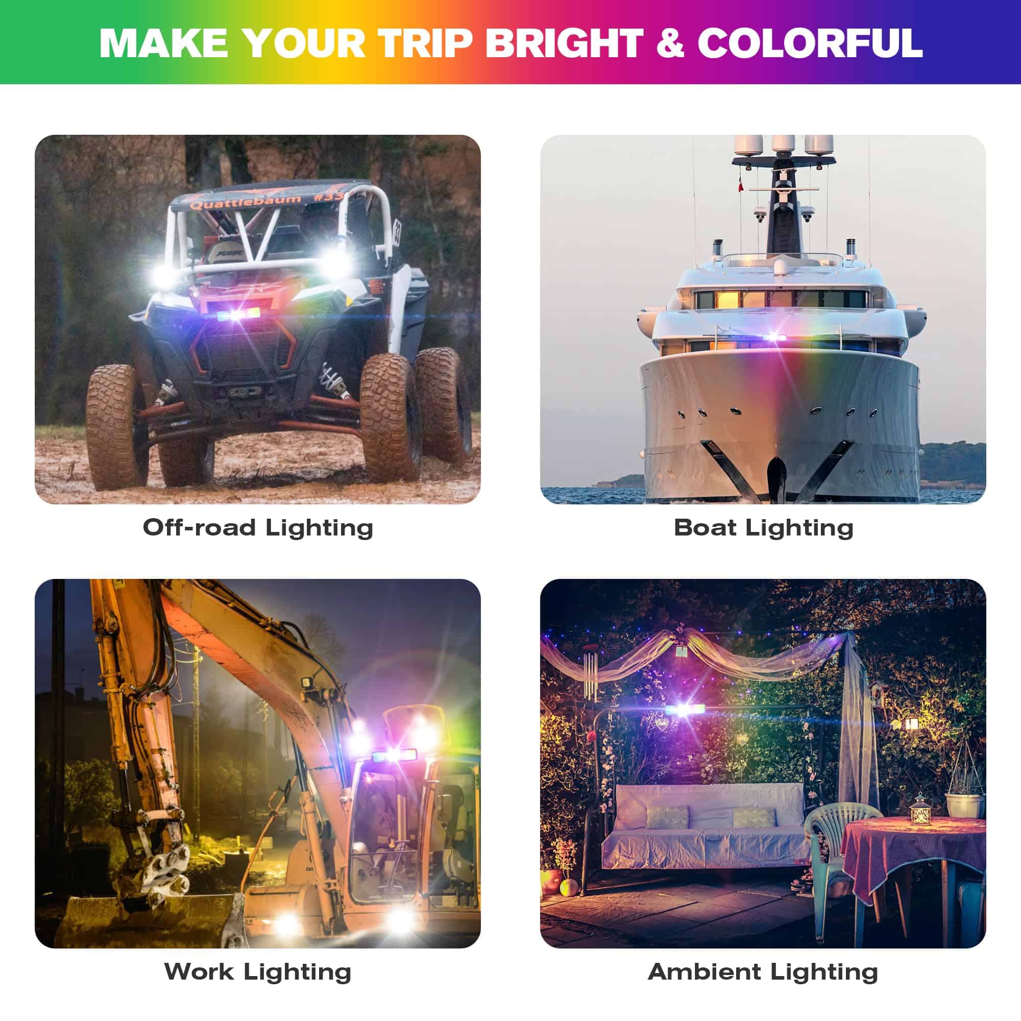 Brand New Upgraded Design Thickened Housing High Power RGB LED Beads PMMA Highly Transparent Lens APP Control RF Remote Control IP68 Waterproof . High Heat Dissipation Integrated die-cast aluminum lamp housing, thickened cooling fins make the lights have stronger heat dissipation performance. The lifespan of led off road lights over 30,000 hours. Two Control Methods The automotive light bars built-in controller, controlled by RF remote control and APP. The APP is rich in functions and supports various dynamics, scenarios and customizations. The RF remote control is simple and practical, and the controller distance is up to 60ft. Widely Applicable With 316SS Bracket & Screws, strict waterproof and anti-corrosion design, the 6 Inch led pod lights bar can easily withstand various harsh scenes. Fit all 12V automotive vehicles trucks off road 4×4, cars, trucks, tractors, SUVs, ATVs, motorcycles, boats, yachts, marine. Product Warranty 24-hour customer service, please contact us immediately if you have any questions. Product defects can be replaced or even refunded free of charge. We will provide multiple solutions until your problem is solved.