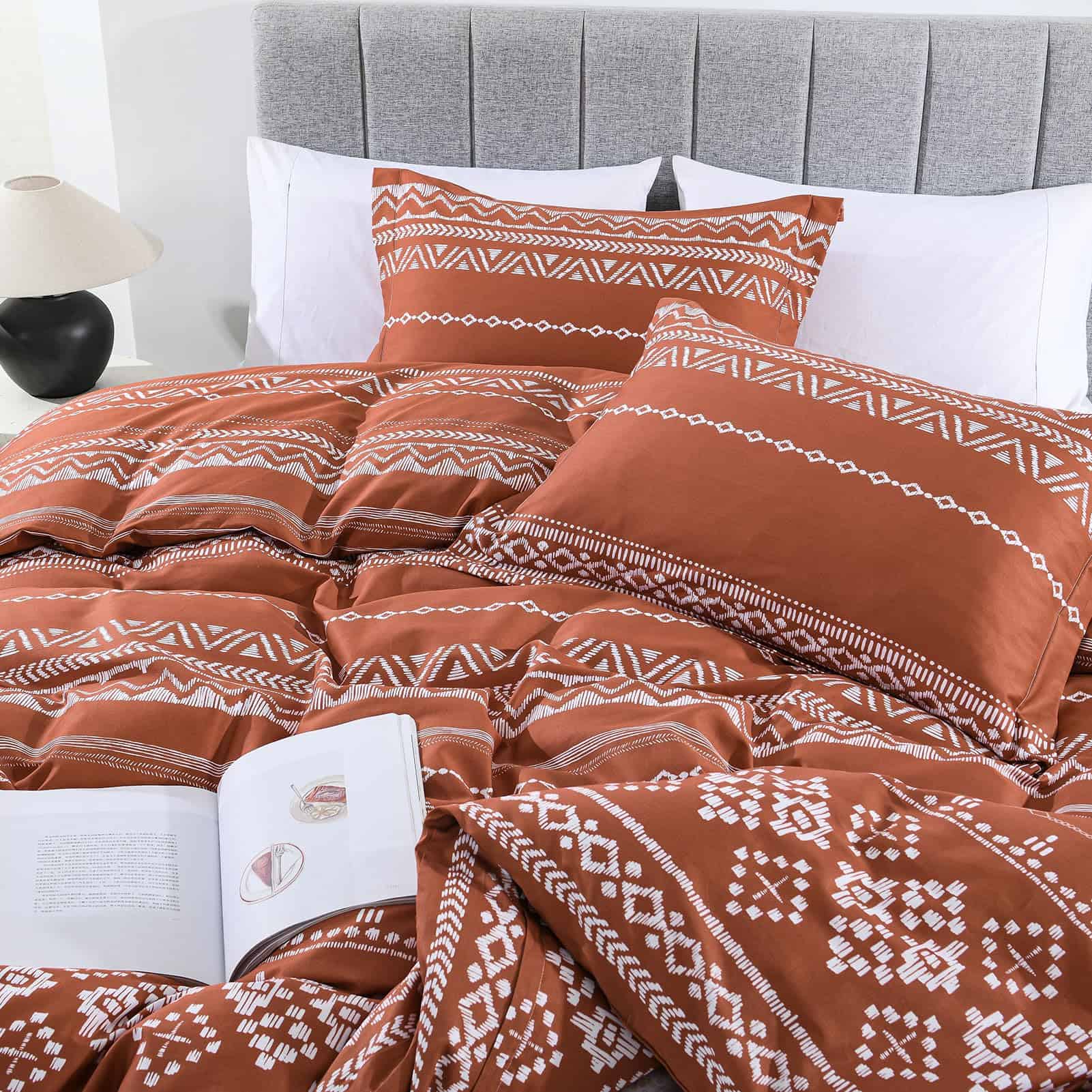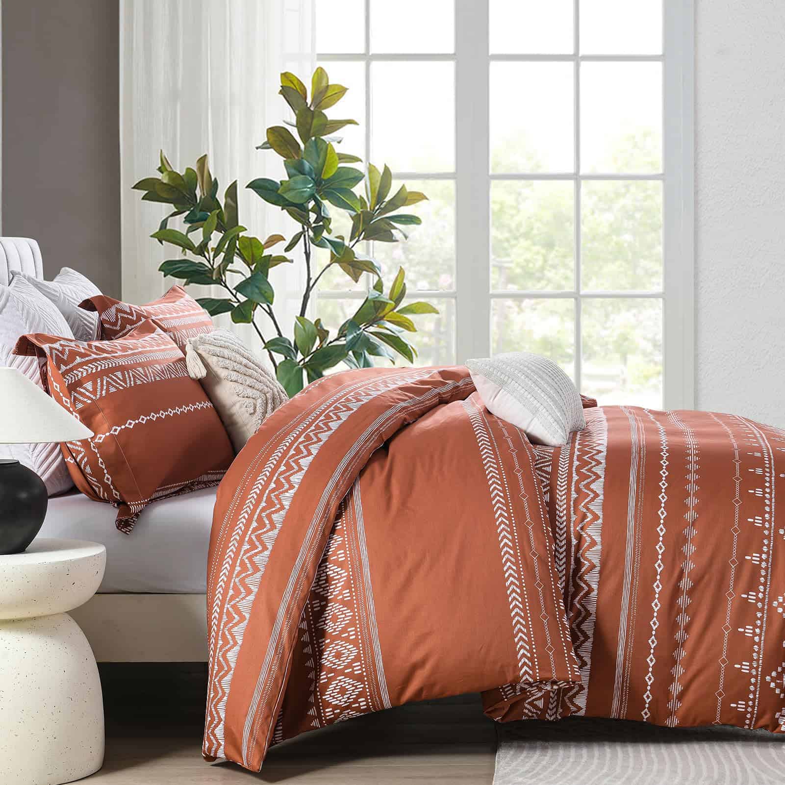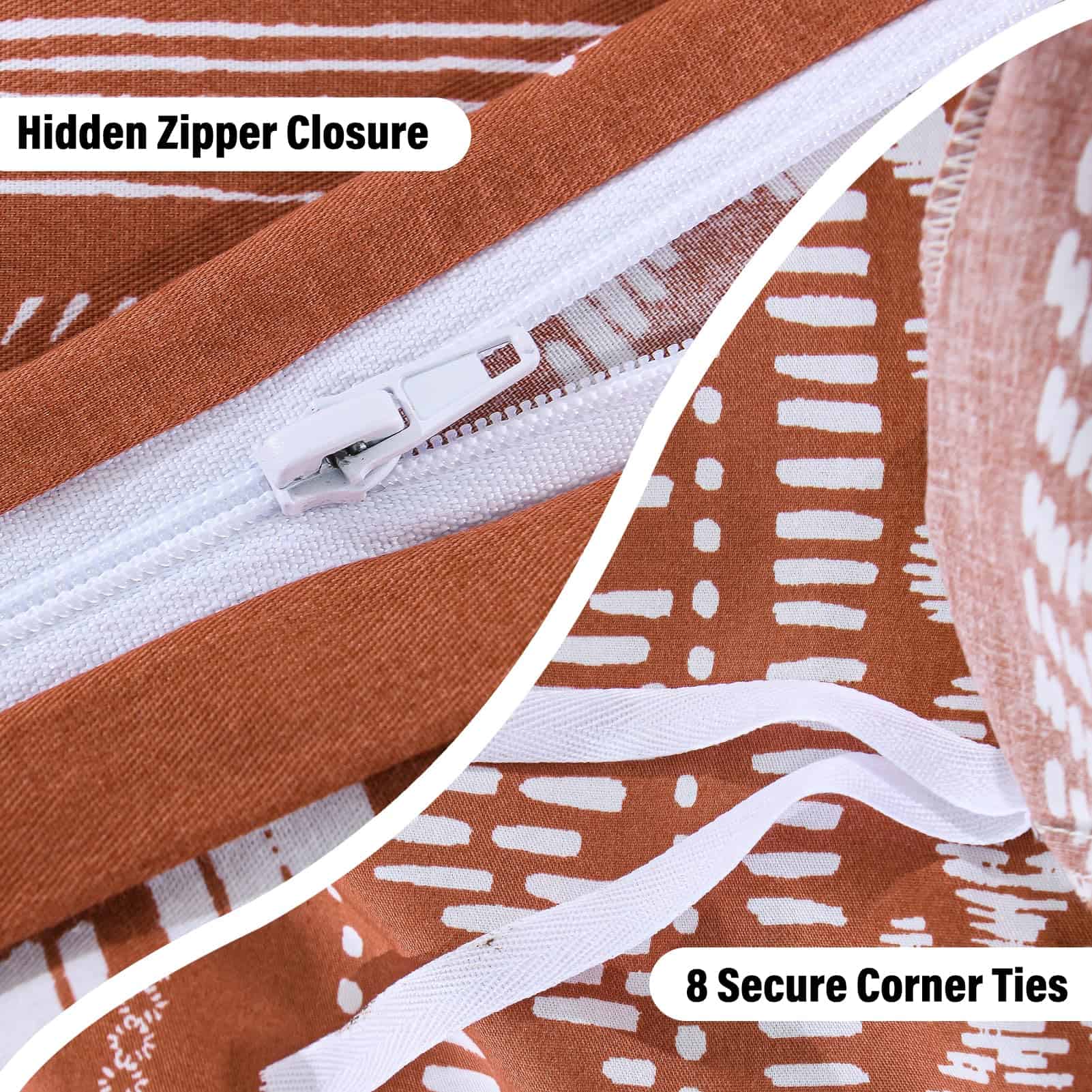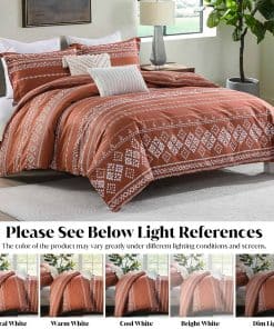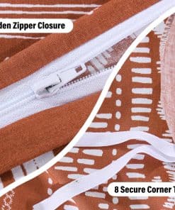 1. Tamaño King & Paquete Incluido Y-PLWOMEN te trae un lujoso juego de ropa de cama de algodón de 3 piezas: 1 funda nórdica tamaño king (104″ x 90″), 2 fundas de almohada (20″x 36″). Nota: El relleno de la funda nórdica y las almohadas no están incluidos. 2. Algodón Ultra Suave & Mejor Sueño Material certificado Oeko-Tex Standard 100. La funda nórdica king está hecha de 100% algodón. La artesanía prelavada hace que la tela tenga una excelente suavidad, no se desvanezca fácilmente, no tenga olor. El set de funda nórdica queen es adecuado para todo el año, es suave, cómodo y transpirable. 3. Diseño & Regalo La exquisita funda nórdica de rayas aztecas color naranja quemado hace eco con tu cálida habitación, hermosa y generosa, brindándote una experiencia visual diferente, disfruta de tu vida. Es una buena opción para tus amigos y familiares. 4. Cierre de Cremallera & 8 Lazos de Esquina El conveniente cierre de cremallera oculto sin complicaciones hace que sea fácil insertar y quitar tu relleno en la funda nórdica, los ocho lazos de esquina mantienen el relleno en su lugar. Déjate dormir pacífica y cómodamente toda la noche. 5. Instrucciones de Cuidado La colección de funda nórdica king de Y-PLWOMEN es fácil de cuidar, por favor no la laves con alta frecuencia. Lavable a máquina a menos de 60ºC. No usar lejía. Secar en secadora con ciclo suave y sin calor. CONSEJOS: Lavar del revés, es mejor secar al natural