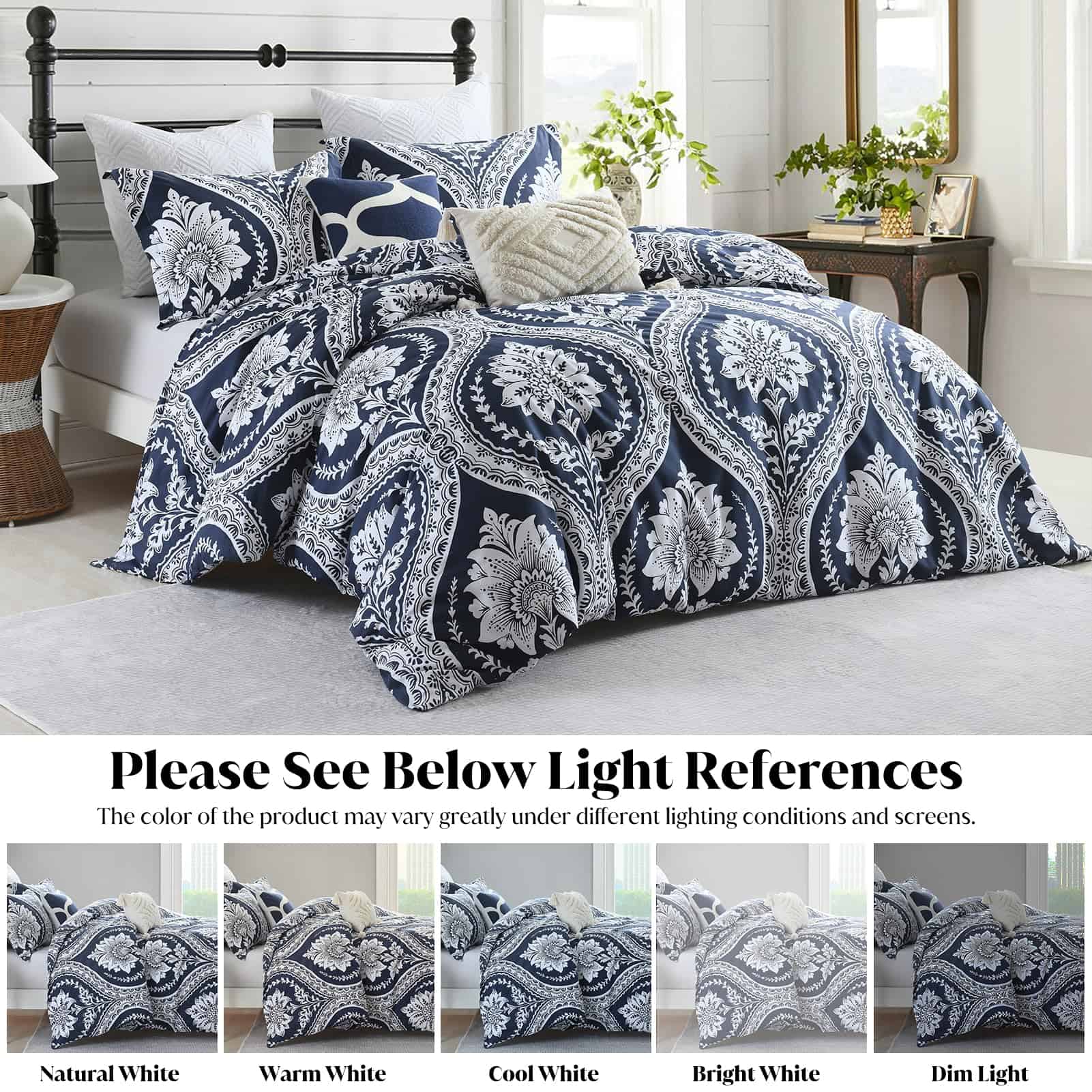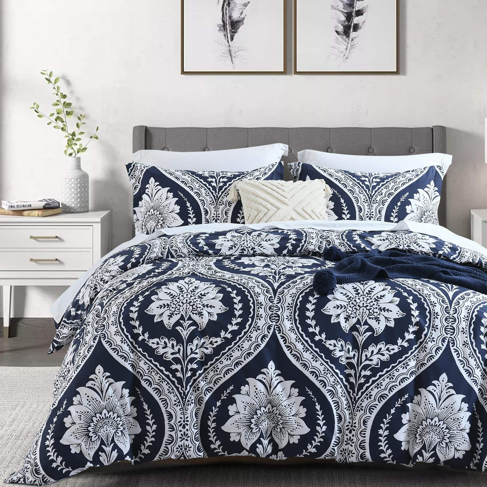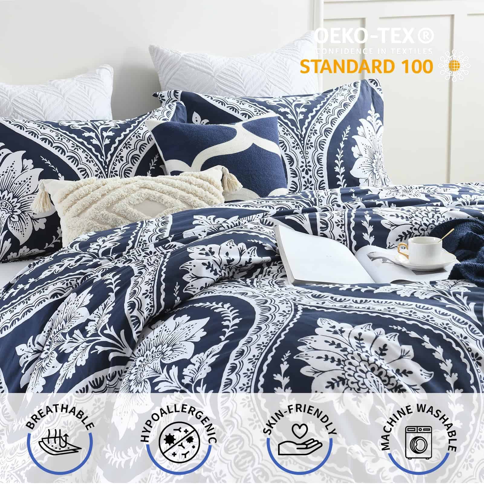 1. Juego de funda nórdica azul queen Y-PLWOMEN hecho de tejido de algodón de tejido percal, esta funda nórdica queen con estampado damasco es transpirable y cómoda, lo que le proporcionará un confort impredecible y el mejor sueño. El método de prelavado hace que el juego de funda nórdica queen sea aún más suave. 2. Estándar OEKO-TEX Esta funda nórdica de paisley con cierre de cremallera tiene producción en fábrica con estándar OEKO-TEX 100, el juego de funda nórdica azul queen tamaño queen adopta una tecnología ambiental de impresión y teñido reactivo que hace que los colores sean más reales, más firmes y no se desvanezcan fácilmente, sin olores, asegurando que los patrones se mantengan nuevos y vivos durante décadas. 3. HERMOSO PATRÓN DE PAISLEY: ¡Este juego de funda nórdica de paisley es hermoso! ¡El impresionante patrón floral de paisley es impresionante! Los colores son brillantes y es muy suave. El color perfecto que estabas buscando para cubrir tu edredón. Es un aspecto bonito que coincide con la decoración de tu dormitorio. 4. 8 Lazos de Esquina y Cierre con Cremallera La funda nórdica floral queen tiene 8 lazos de esquina y un cierre de cremallera oculto aseguran que su funda nórdica se ajuste de manera ultra precisa y evite que se resbale. El cierre de cremallera oculto facilita la colocación y extracción de la funda nórdica azul queen tamaño queen y apunta a un uso más duradero que el cierre de botones. 5. Juego de Funda Nórdica Queen Incluye Nuestra funda nórdica de algodón 100% queen incluye 1 funda de edredón queen size (90″ x 90″) y 2 fundas de almohada (20″ x 28″). (Sin Relleno ni Almohada Incluidos)
