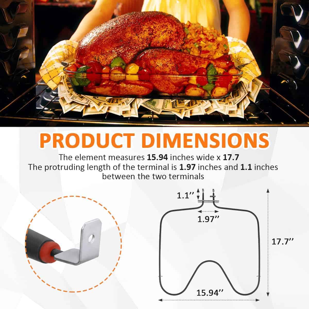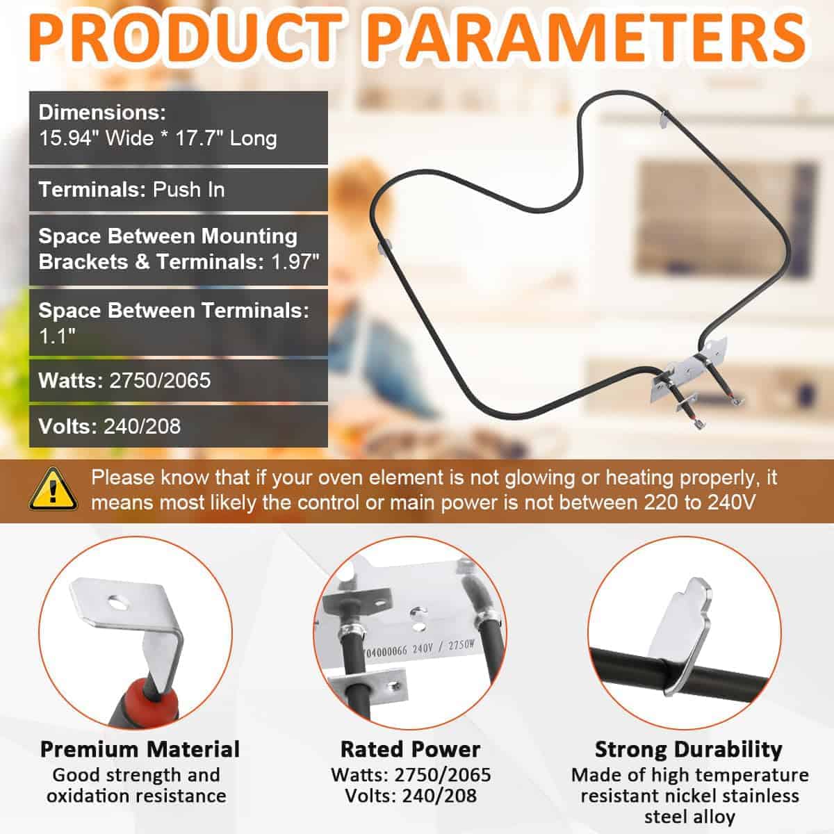 5. Este es un elemento calefactor de repuesto del mercado de accesorios, y está diseñado para adaptarse a una amplia gama de modelos y marcas de hornos diferentes, Las dimensiones son: 17.7″ desde el frente hasta el soporte de montaje 15.94″ de ancho ,1.97″ desde el soporte de montaje hasta el extremo del terminal, la barra está ligeramente doblada hacia abajo Los terminales están doblados en un ángulo de 90 grados Los agujeros de montaje miden 1.1″ de distancia de centro a centro, Vatios: 2750/2065, Voltios: 240/208.