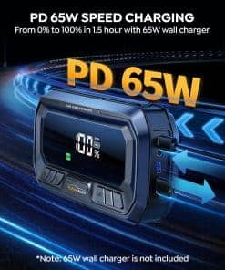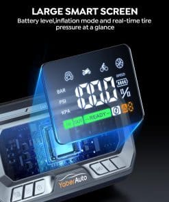 1. 10-EN-1 ARRANCADOR DE SALTO DE COCHE MULTI-FUNCIONAL ¡Di adiós al arrancador de batería de coche general! YA90 es más potente, integra 10 funciones prácticas para cubrir todas tus necesidades, incluido el arranque de emergencia para coche de 7000A, bomba de neumáticos, manómetro, 4 modos de luces (linterna, estrobo-blanco, estrobo-rojo, SOS), banco de energía portátil, carga rápida de 65W y DC de 160W con adaptador de encendedor de cigarrillos DC. Potente, versátil y un kit imprescindible para viajes por carretera. 2. ARRANQUE DE BATERÍAS COMPLETAMENTE MUERTAS Potente y seguro, Con una potencia de 7000A, la caja de arranque de batería de coche puede arrancar instantáneamente vehículos de 12V con motores de gasolina/12.0L diésel. Cables de puente duraderos extendidos para llegar a terminales de batería variados. Y el arrancador de batería de coche portátil tiene la FUNCIÓN DE ARRANQUE POR FUERZA, un solo toque para «BOOST» completamente baterías de coche muertas o con bajo voltaje. 3. INFLADOR DIGITAL CORDLESS DE 160 PSI Fácil de usar, preajustado inteligente, detección de presión y apagado automático. Con un turbo superior de 45 L/min (160 PSI) que dura 35 minutos. El arrancador de batería de coche portátil con compresor de aire infla un neumático de coche a 30 PSI en solo 2 minutos. Pantalla LCD grande de 3.3″ para leer la presión de neumáticos en tiempo real, 3 unidades opcionales (PSI, BAR, KPA), 5 modos de inflado (Coche, Motocicleta, Bicicleta, Baloncesto e Inflado Personalizado, selecciona el Modo de Inflado Personalizado para inflar por encima de 60 PSI, hasta 160 PSI), 3 boquillas diferentes y manguera de aire extendida desmontable para inflar coches, bicicletas, pelotas, etc. 4. CARGA RÁPIDA DE 65W+18W+160W Revela la increíble tecnología de Carga de Velocidad Bidireccional PD65W USB-C IN/OUT, solo 1.5 horas pueden cargar completamente el arrancador de batería de coche desde 0% hasta 100%. Una carga de 5 minutos para ponerse en marcha. Potenciación 5 veces más rápida de tus teléfonos, tabletas y portátiles. Salidas USB-A dobles adicionales (12W/18W) para cargar varios dispositivos simultáneamente, el modo de salida continua de 160W DC mejorado proporciona energía constante a dispositivos de 12V en vehículos como compresores de aire y neveras de coches. La caja de salto para coche de batería en espera durante aproximadamente 24 meses, siempre lista para ayudarte. (Nota: el cargador de pared de 65W no está incluido). 5. LUCES DE 600 LÚMENES Y ASA RETRÁCTIL Luces LED brillantes de 600 lúmenes, 6-7 veces más brillantes que otros arrancadores de batería portátiles para coches, se encienden hasta 96 horas constantemente. 4 Modos de luces (linterna/estrobo-blanco/estrobo-rojo/SOS) para diferentes emergencias y se duplican como un triángulo de advertencia. Diseño humanizado, con un resistente asa retráctil para transportar. 6. PANTALLA DE 3.3 PULGADAS Y 10 PROTECCIONES DE SEGURIDAD Pantalla LCD de 3.3″, fácil de usar, el nivel de batería, indicación de mal funcionamiento, modo de inflado, presión de neumáticos en tiempo real de un vistazo. El arrancador de batería de coche portátil es 100% seguro, 10 tipos de protecciones incluyen a prueba de chispas y protección de polaridad invertida sin tener que preocuparse por conexiones incorrectas o chispas. 7. QUÉ OBTIENES YaberAuto YA90 pack de salto (1 arrancador con compresor de aire, 1 cables de puente pesados, 1 manguera de la bomba de aire, 3 boquillas de gas, 1 cable de carga USB-C, 1 cable de carga USB-A, 1 adaptador de encendedor de cigarrillos DC, 1 manual del usuario, 1 estuche de transporte EVA portátil, garantía de 12 meses y soporte técnico de por vida. Si tienes alguna pregunta post-venta sobre los arrancadores de baterías, contáctanos.