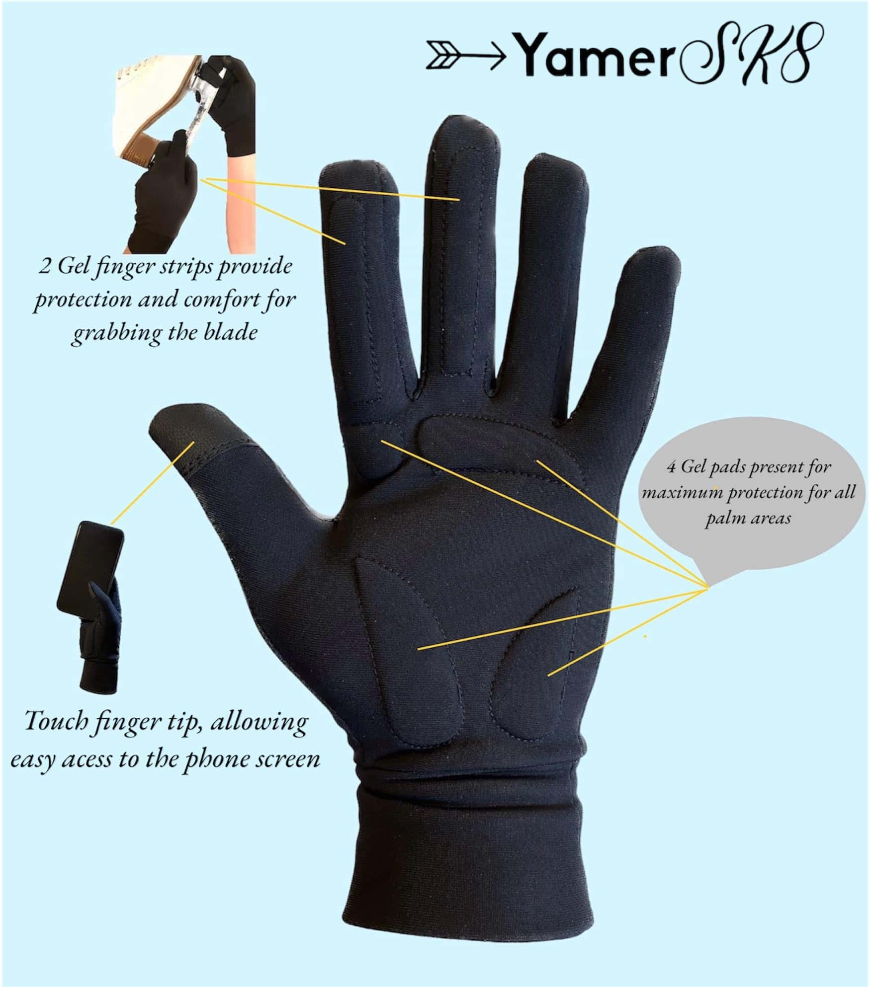 Los Guantes YamerSK8 con Almohadillas de Gel están especialmente diseñados para patinadores artísticos que están desarrollando nuevos saltos y giros para proteger la palma y los dedos de lesiones no deseadas y molestias. 4 Almohadillas de gel para máxima protección. El producto no restringe el movimiento o el agarre, con un material flexible que proporciona total comodidad. El poliéster 100% ofrece protección contra el agua, eliminando la sensación de humedad que muchos patinadores encuentran frustrante. Dos tiras de gel en los dedos crean protección para agarrar las cuchillas en giros verticales y de espalda. El diseño acolchado hace que el agarre sea cómodo, asegurando que tu mano nunca resbale en el momento importante. El producto también contiene una punta de dedo táctil, permitiendo un fácil acceso a la pantalla del teléfono. El material elástico se ajusta cómodamente alrededor de la mano, adaptándose a cualquier forma. La parte interna de los guantes crea una experiencia suave y cómoda.