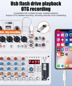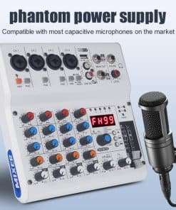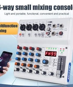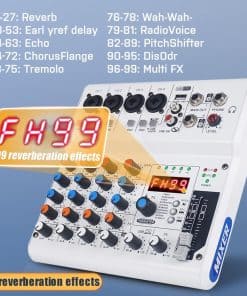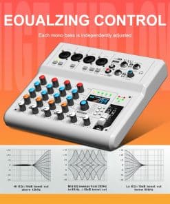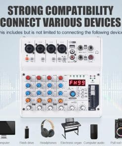 El mezclador de audio de 6 canales Yamnweo incluye 6 entradas MIC/LINE mono + 1 entrada estéreo, perfecto para las creaciones de audio de los usuarios. El ecualizador de sobremarcha en todos los canales inyecta una calidez y detalle increíbles en la señal del personaje musical. Conéctese de forma inalámbrica con su iPad, iPhone y smartphone Android a través de Bluetooth y conecte el micrófono para reproducir música, karaoke, transmisiones en vivo y más. Compatible con USB, lectores de memoria, MP3. Conecte un USB externo, computadora, unidad flash o dispositivo Bluetooth para mezclar y grabar. Utilice los controles integrados para reproducir/pausar, saltar pistas y cambiar entre modos. El mezclador tiene una entrada XLR con phantom power de 48V. Puede alternar entre phantom power de 48V y distorsión de ruido ultra bajo a voluntad para que el mezclador funcione con micrófonos de condensador. Puerto USB para PC/grabación o reproducción de audio. Compatibilidad con lector de tarjetas USB/Flash/MP3: Conecte su USB externo, computadora, unidad flash o dispositivo Bluetooth para mezclar y grabar utilizando los controles integrados para reproducir/pausar, saltar pistas y cambiar modos. Funciones profesionales del mezclador: ecualización estéreo, ajuste fino de ganancia, 99 tipos de efectos DSP que se pueden aplicar a la salida de síntesis/grabación, y crear la calidad de sonido deseada para diferentes escenarios.