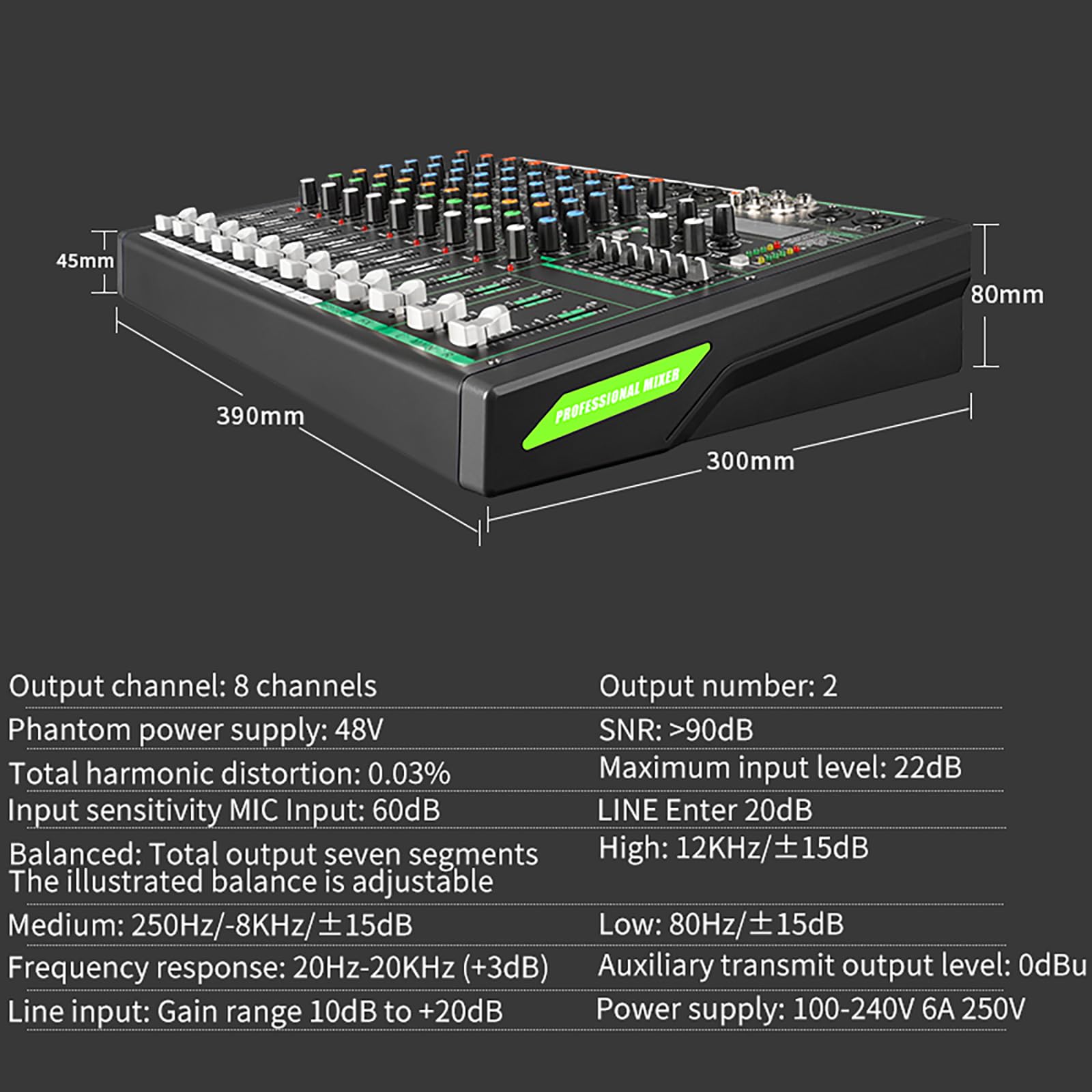 Más información sobre el increíble mezclador de DJ Yamnweo MIX-8. Con 8 canales de entrada y XLR, este mezclador ofrece una variedad de funciones y efectos avanzados para una experiencia de audio profesional. La ecualización de 7 bandas equilibra perfectamente el volumen total para un sonido claro y nítido. Además, con 99 efectos DSP incorporados, como reverberación, coro, flanger, delay, cambio de tono y más, experimentará efectos de audio de calidad de estudio. Las salidas de cada canal incluyen controles para monitoreo de auriculares, grabación y equipos estéreo, lo que le brinda un control total sobre su mezcla. La función USB/Bluetooth le permite reproducir una variedad de formatos y conectar dispositivos como teléfonos celulares y tabletas para una reproducción fácil y conveniente. Ya sea para karaoke, transmisión de audio o edición de video, este mezclador de DJ es la elección perfecta para sus necesidades de mezcla de audio. ¡Obtenga el Yamnweo MIX-8 hoy y lleve su mezcla al siguiente nivel!