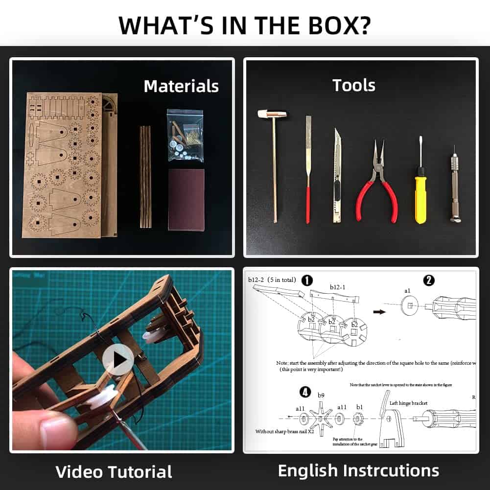 4. ¿Qué hay en la caja? El kit incluye los materiales necesarios para el ensamblaje, un set de herramientas de ensamblaje, un manual de ensamblaje en inglés y un tutorial detallado de ensamblaje en video paso a paso para ayudarte en el ensamblaje. Solo necesitas tu pegamento y suficiente paciencia, podrás disfrutar del proceso de ensamblaje inmersivo y la alegría de un ensamblaje exitoso.
