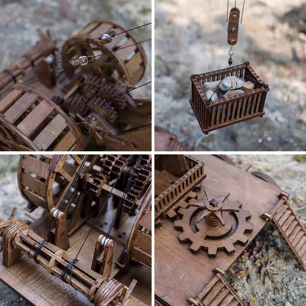 1. Modelo de grúa de madera medieval a escala La grúa se utiliza para levantar y mover objetos pesados. El modelo utiliza el principio del tren de engranajes reductores y el bloque de poleas móviles y fijas para ahorrar trabajo.
