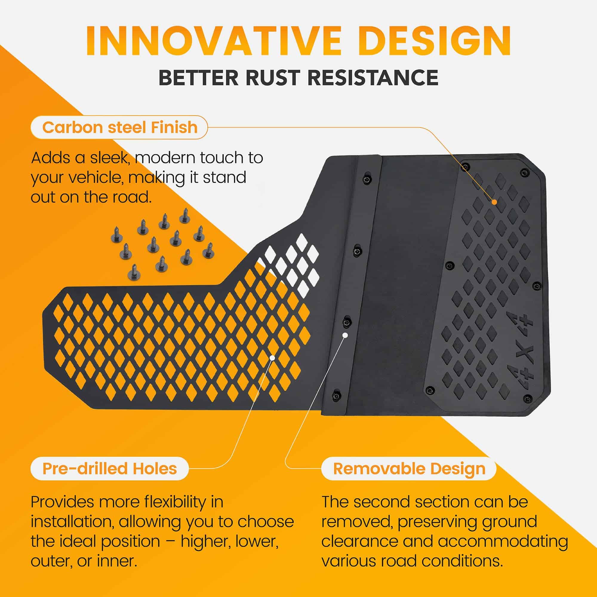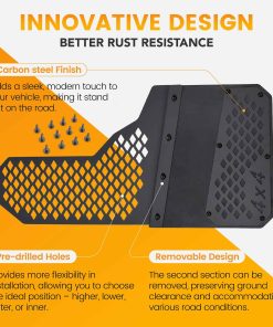 2. Protección integral del vehículo Bloquea el barro, la nieve, la grava y otros desechos de manera efectiva, manteniendo tu vehículo limpio y libre de rayones. Perfecto tanto para aventuras todoterreno como para desplazamientos diarios.