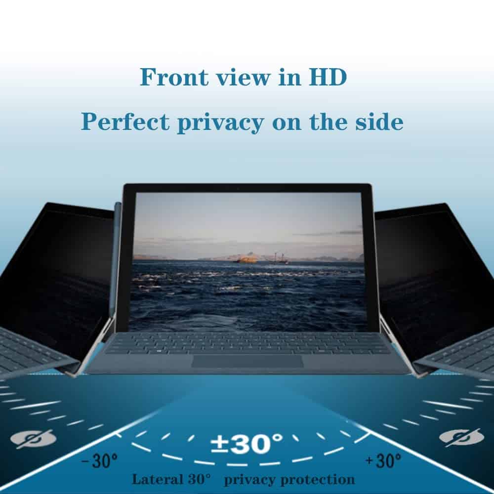 Los productos de YBP están diseñados para ser buenos compañeros en su oficina o vida. Este ángulo de privacidad del Surface Book 1/2 es de 305 grados, la transparencia es del 60%5, el grosor es de 0,35 mm. está diseñado para evitar que su confidencialidad sea robada por espectadores. Presenta pequeñas persianas verticales en su superficie que estrechan el ángulo de visión a una banda limitada a 30 grados a cada lado del centro. Con este Filtro de Privacidad obtienes una claridad de imagen nítida en tu pantalla pero invisible desde la vista lateral. Además, las pantallas de privacidad reversibles también utilizan un revestimiento antirreflectante para reducir el deslumbramiento y filtran la dañina luz azul hasta en un 30 por ciento. Independientemente de si necesitas trabajar o necesitas pasar el tiempo, puedes estar seguro de que tu pantalla de computadora permanecerá privada al usar este Filtro de Privacidad. El producto es bastante fácil de instalar. Las personas que nunca han pegado una película protectora en una pantalla también pueden hacerlo al alinear y pegar rápida y precisamente de acuerdo con los accesorios de instalación y el método de instalación proporcionados por nosotros. Con su excelente función antiespía, el producto es ampliamente aplicable para áreas públicas como oficinas de planta abierta, campus, instituciones financieras, conferencias comerciales de viajes, cafeterías, aviones y trenes, siendo apreciado por personas de todas las clases sociales. NOTA:Nuestros filtros de privacidad son más brillantes y claros que otras soluciones. El efecto de protección de privacidad se ve afectado por la luz ambiental del usuario y la luminancia de la pantalla. Cuanto más fuerte sea la luz ambiental, mejor será el efecto de protección de privacidad. Además, si se ajusta la luminancia de la pantalla a menos del 70%, el efecto de protección de privacidad es mejor.