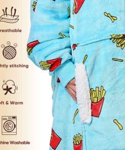 Manta sudadera de gran tamaño con diseño personalizado perfecta para las mañanas de invierno. Forro polar sherpa de 200 GSM te mantiene abrigado como una manta térmica en movimiento. Costuras reforzadas y longitud adecuada para mayor comodidad. Bolsillo frontal grande para teléfono y mangas con puño acanalado para un ajuste perfecto y mayor libertad de movimiento. Regalo ideal para tus seres queridos.