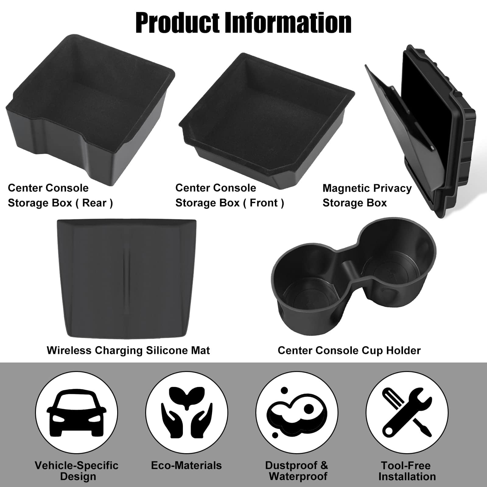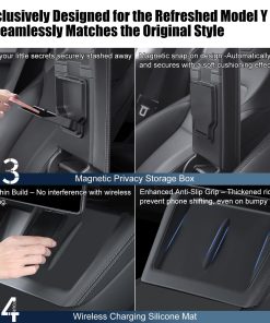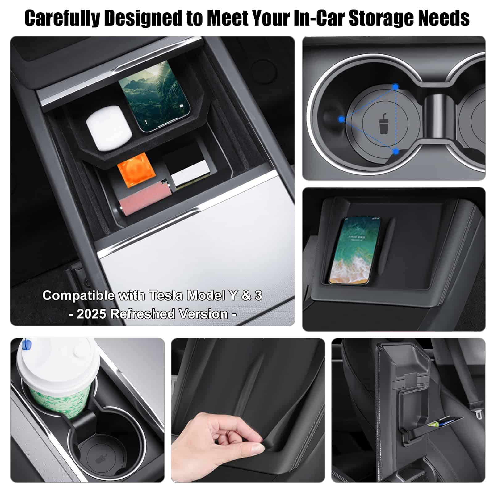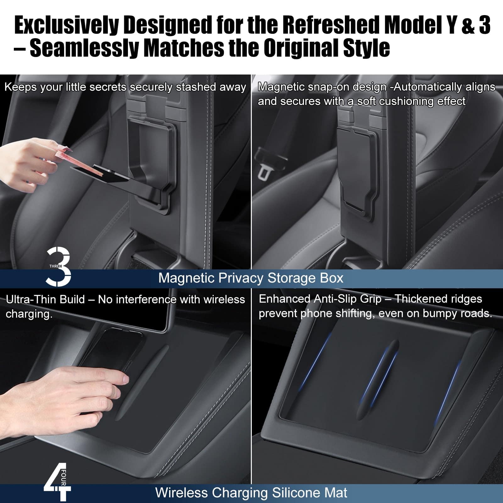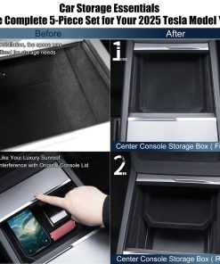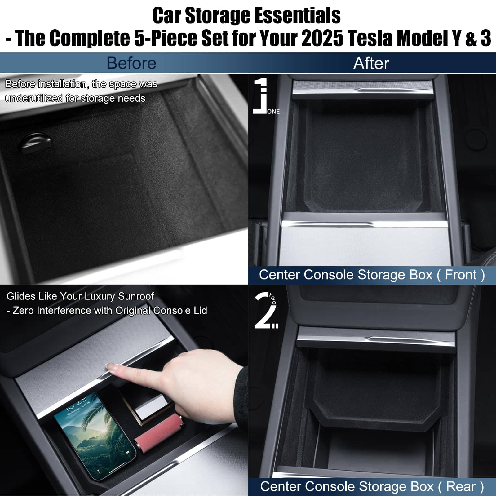 Actualiza el Interior de tu Tesla con Almacenamiento de Precisión Mantén tu Tesla Model Y/3 Refresh Edition 2025 libre de desorden con este juego de organizadores de primera calidad de 3 piezas, diseñado para conductores que valoran tanto el estilo como la funcionalidad. Por Qué Elegir Nuestro Juego de Organizadores para Tesla MODEL Y & 3 Garantía de Ajuste Exacto Utilizando un escaneo 3D, cada componente se adapta perfectamente al diseño interior renovado de tu Tesla sin interferir con los portavasos deslizantes o los puertos de carga. Protección de Lujo Carcasa a Prueba de Arañazos ABS: Soporta el calor del verano (hasta 185 F) y el frío del invierno (-40 F) sin deformarse Interior de Fieltro Aterciopelado: Acolchado de 2 mm que evita arañazos en los artículos y reduce el ruido de la carretera Características Consideradas La tapa de privacidad magnética permanece cerrada durante la conducción enérgica Lo Incluido Organizador de Consola Central x1 Bandeja de Almacenamiento de Reposabrazos x1 Caja de Almacenamiento Oculta Magnética x1