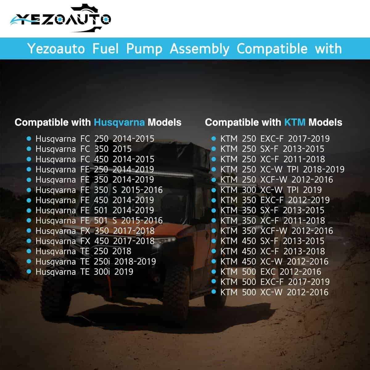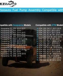 1. Compatibilidad con vehículos La bomba de combustible de Yezoauto es compatible con Gas-Gas EC 300 2021-2023; EX 250F 2021-2023; EX 300 2021-2023; EX 350F 2021-2023; EX 450F 2021-2023 & Husqvarna FE 250 2020-2021; FE 350 2020-2022; FE 350 S 2020-2022; FE 450 2020; FE 501 2020-2023; FE 501 S 2020-2023; FX 350 2019-2022; FX 450 2019-2022; TE 150i 2020-2023; TE 250i 2020-2023; TE 300i 2020; TX 300i 2020-2023 & KTM 150 XC-W TPI 2020-2023; 250 EXC-F 2018-2019; 250 XC TPI 2020-2022; 250 XC-F 2019-2022 y más.