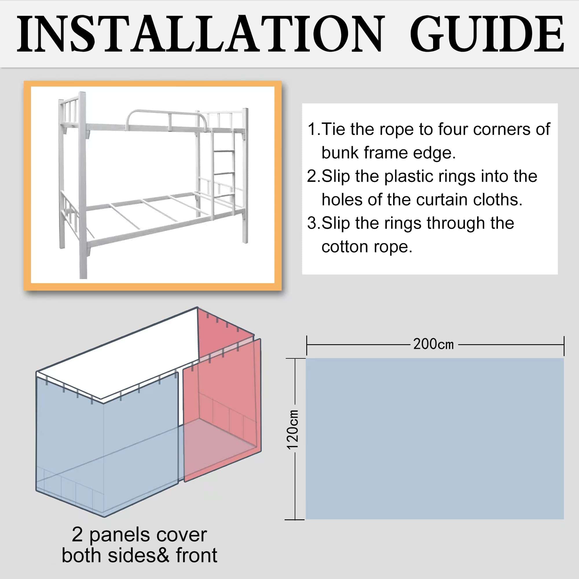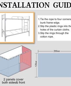 2. Contenido del paquete: Hay dos cortinas en cada paquete. Cada cortina para cama litera mide 2M de largo y 1.2M de alto, adecuada para camas de tamaño estándar en dormitorios estudiantiles y camas infantiles en casa. 2 piezas de tela para sombrear el frente y dos lados.