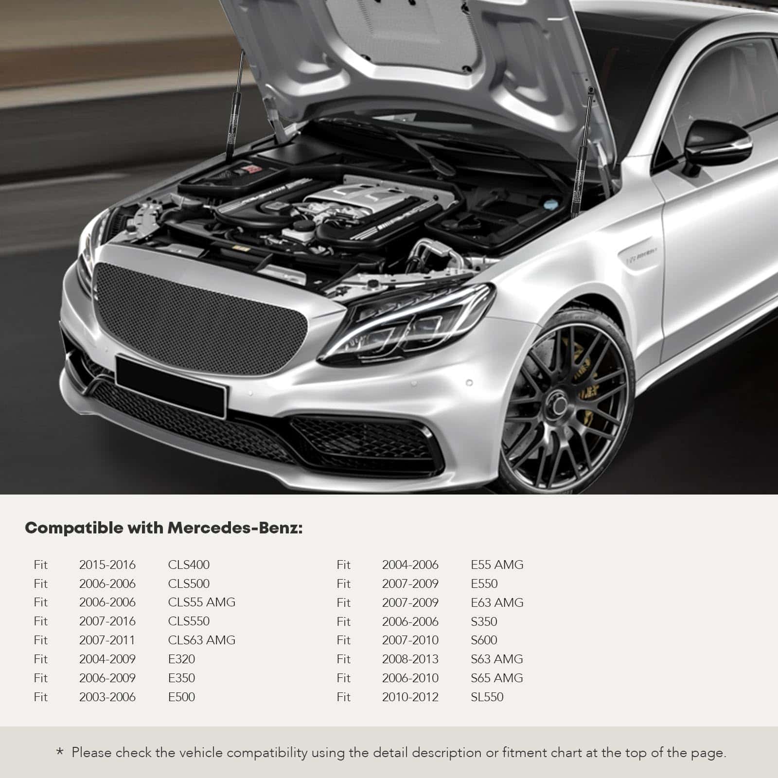 Los amortiguadores de gas YHTAUTO son compatibles con varios modelos de Mercedes-Benz, incluidos CLS400, CLS500, CLS55 AMG, S350, CLS550, CLS63 AMG, E320, E350, E500, E55 AMG, E550, E63 AMG, S600, S63 AMG, S65 AMG, SL550. Este conjunto de amortiguadores a gas de repuesto para el capó del automóvil es fácil de instalar en minutos con herramientas simples. Los amortiguadores están fabricados con materiales de alta calidad y un proceso de recubrimiento especial para resistir la corrosión, el óxido y los impactos.