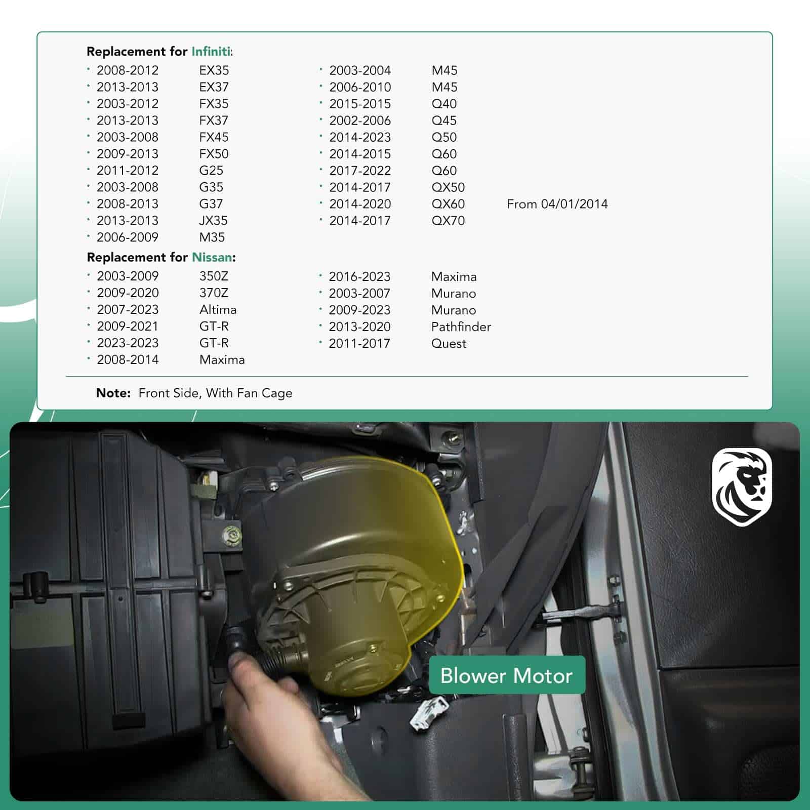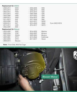 YHTAUTO Reemplazo OE del Motor del Soplador de Aire Acondicionado y Calentador, Ajuste Directo. Número OE: 27225-JK61A, 27200-JA000, 27225-JK60E, 27225-JK60B, 700193, 75850, PM9136 Ubicación: Frontal Cantidad Vendida: Una Pieza Garantía: Garantía de Calidad de Un Año y Kilometraje Ilimitado Ajuste: Infiniti EX35 2008-2012 Infiniti EX37/JX35 2013 Infiniti FX35 2003-2012 Infiniti FX45 2003-2008 Infiniti FX50 2009-2013 Infiniti G25 2011-2012 Infiniti G35 2003-2008 Infiniti G37 2008-2013 Infiniti M35/M45 2006-2007 Infiniti M45 2003-2004 Infiniti Q45 2002-2006 Infiniti Q50/QX50/QX70 2014-2017 Infiniti Q60/QX60 2014-2015 Infiniti QX60 2017 Nissan 350Z 2003-2009 Nissan 370Z/GT-R 2009-2017 Nissan Altima 2007-2014 Nissan Maxima/Murano 2009-2014 Nissan Murano 2003-2007 Nissan Pathfinder 2013-2014 Nissan Quest 2011-2017
