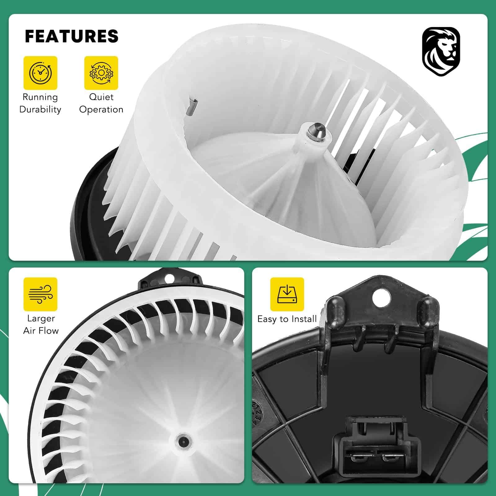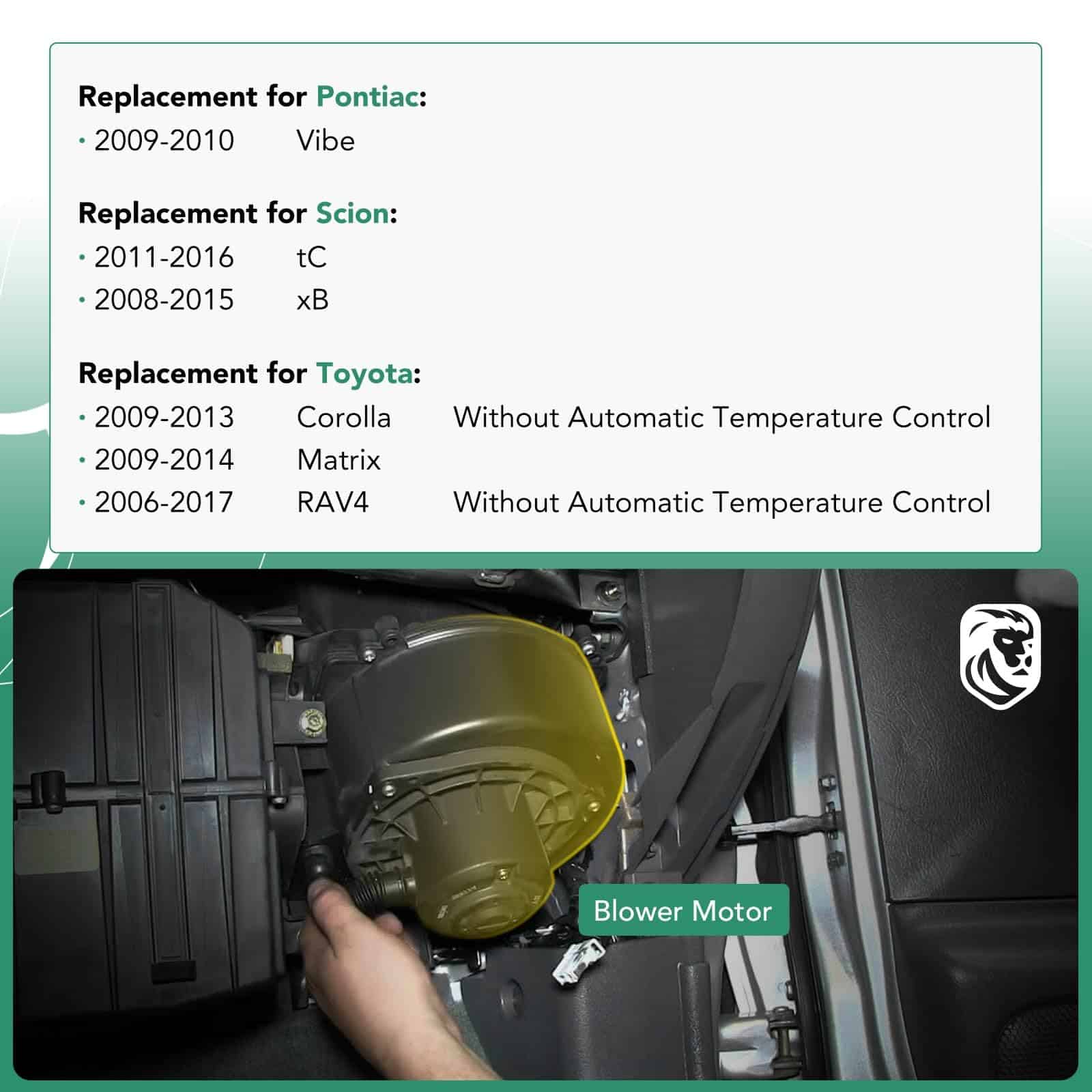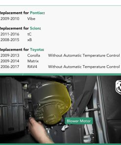 YHTAUTO Motor Soplador de Aire con Jaula de Ventilador de Repuesto para Toyota RAV4 2006-2018 (2013-2018 sin ATC), Corolla 2009-2013, Matrix 2009-2014, Pontiac Vibe 2009-2010, Scion tC 2011-2016, xB 2008-2015. Los motores sopladores de aire YHTAUTO están fabricados con material de calidad superior, generalmente es un motor y una jaula de ventilador, con una carcasa metálica alrededor. Repuesto para Pontiac Vibe 2009-2010, para Scion tC 2011-2016, xB 2008-2015, para Toyota Corolla 2009-2013 (sin ATC), Matrix 2009-2014, RAV4 2006-2018 (06-11 solo para modelos Base/Sport y No para modelos Limited, 12 para modelos Base/Sport/EV, 13-14 para modelos LE/Limited/XLE; 13-18 sin ATC). Número de referencia OE 700230, 19184662, 87103-02200, 87103-42090, 94767137, 1581132, 1581134, 2311714, PM9368, 615-50122, cumple con el rendimiento OE, funciones, reemplazo directo. El motor soplador consta de un motor eléctrico y una jaula de ventilador. El motor hace girar el ventilador, ayudando a extraer y empujar el aire a través de un sistema que contiene un núcleo de calentador, evaporador y conductos. Por favor, ingrese su marca, modelo, año y nivel de acabado para verificar si se adapta a su automóvil. No dude en contactarnos si tiene alguna duda o consulta.