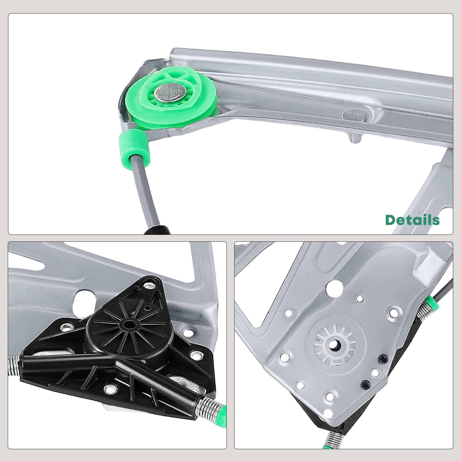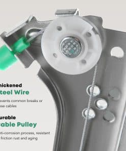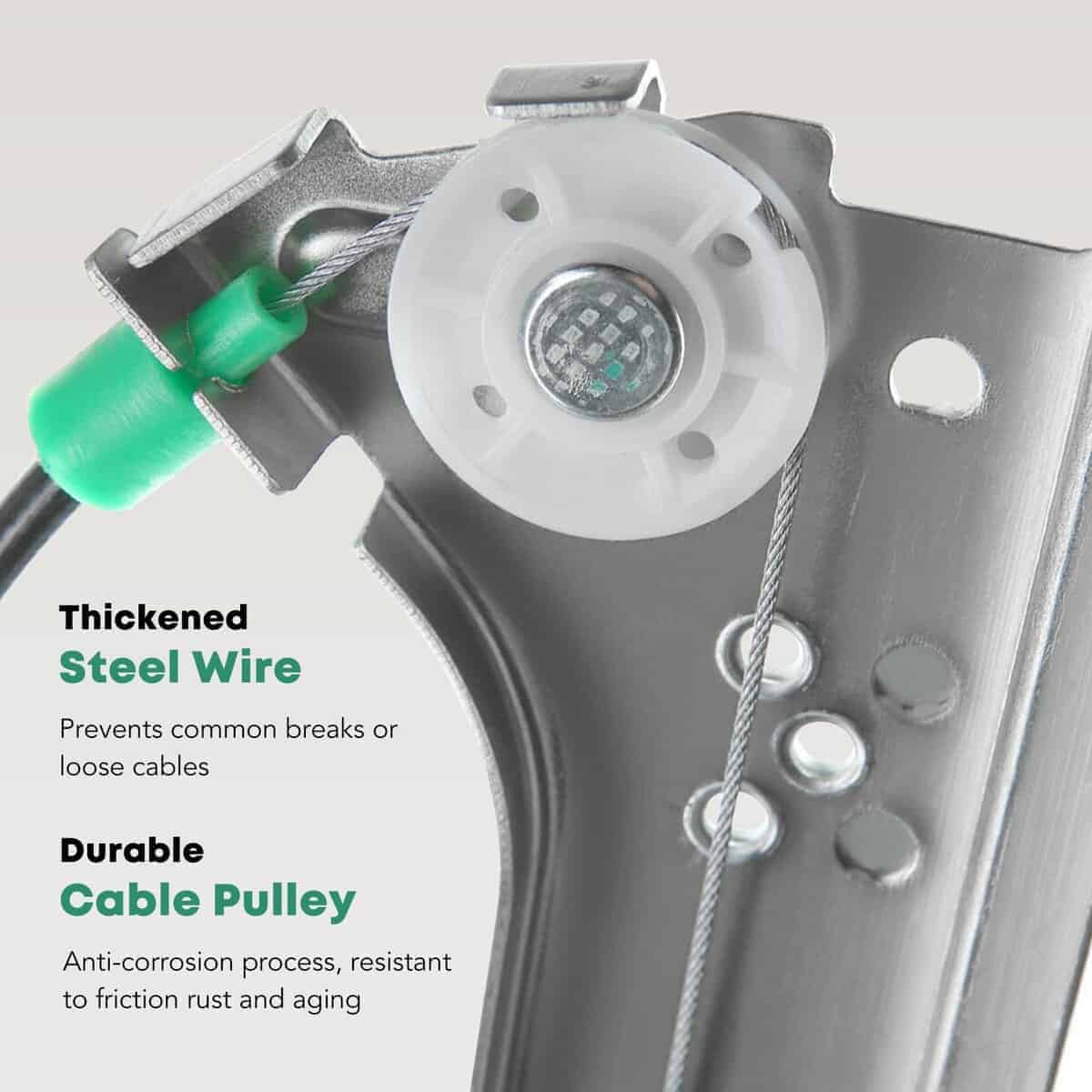 3. Operación estable: Nuestra fabricación asegura que el relé del regulador de ventana, el cable, los clips y la polea son duraderos según los estándares, habiéndose probado hasta 30,000 veces en funcionamiento. Los kits de hardware del regulador de ventana están construidos para resistir de -10 F a 150 F. Incluso en condiciones climáticas adversas, la ventana se desliza suavemente sobre las guías de rodillo.